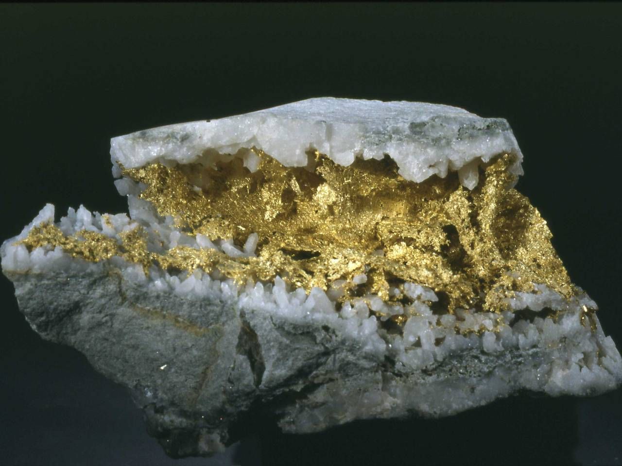 По геологии золото встречается чаще всего в гидротермальных кварцевых жилах. Т.е. кварц, можно сказать, вырос из растворов гидротермальных выходов. Вероятно всего – и золото так же.