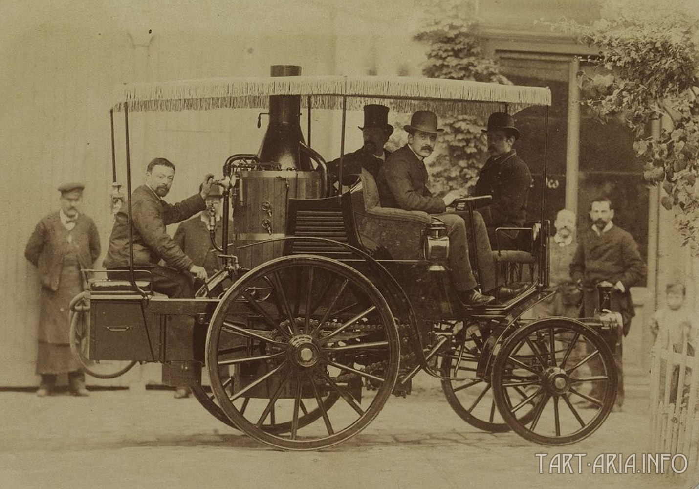 Как вы думаете, на чем он работал - дровах, дизтопливе или коробочке Тесла (которую Тесла на то время ещё не изобрёл)? Полагаю, ни на одном из этих трёх. Это обычный паровой локомобиль 19 века. Что там превращало воду в пар, мы уже не узнаем. Но трудно представить мужчину, который сзади, чтобы он подбрасывал дрова и, как в детской песенке, бибикал без конца. На то время это была техника класса люкс, и вряд ли её владелец позволил себе пачкаться и дышать гарью.