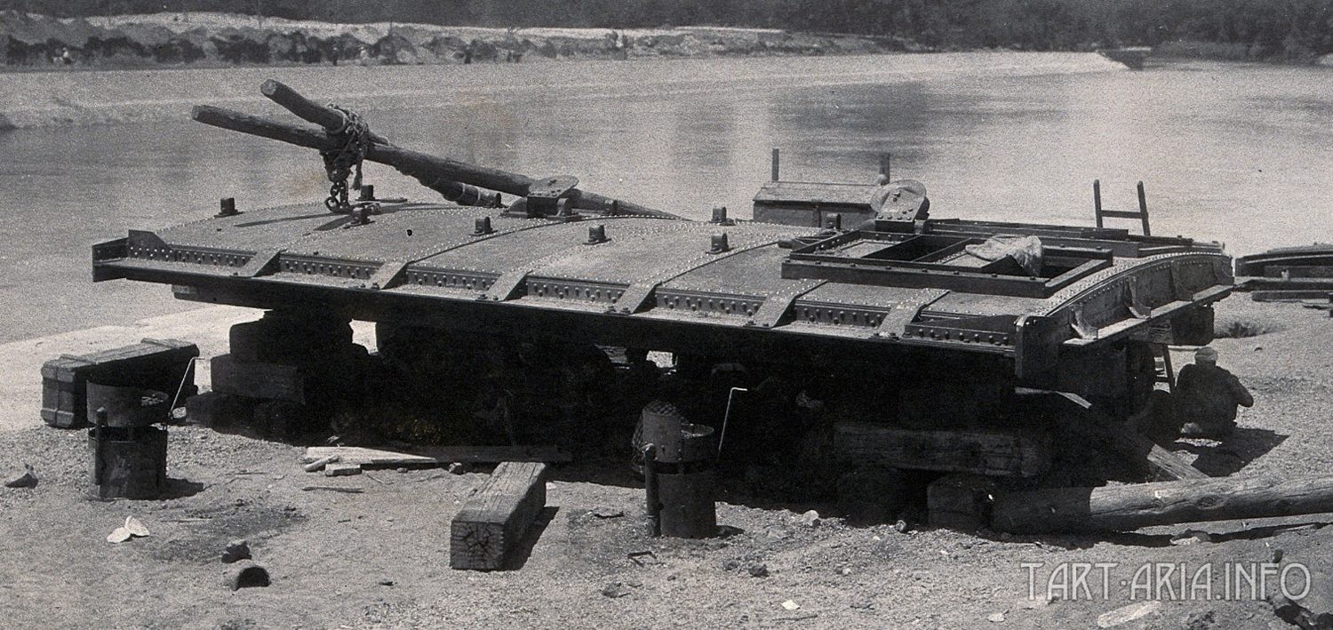 Это обычный понтон, запечатленный в Египте в период 1860-1870 годов. Откуда он там взялся? Возможно, его оставила армия Наполеона после переправы через Нил, а местное население потом приспособило. Ну не пропадать же добру. Но нас будет интересовать совсем не это. Взгляните на его исполнение. Это сколько же надо было поставить клёпок, причём такого же идеального размера? Ну допустим, такое изделие ещё можно собрать в цехе из двух половинок, и клёпки можно забить средствами малой механизации. А как быть здесь?