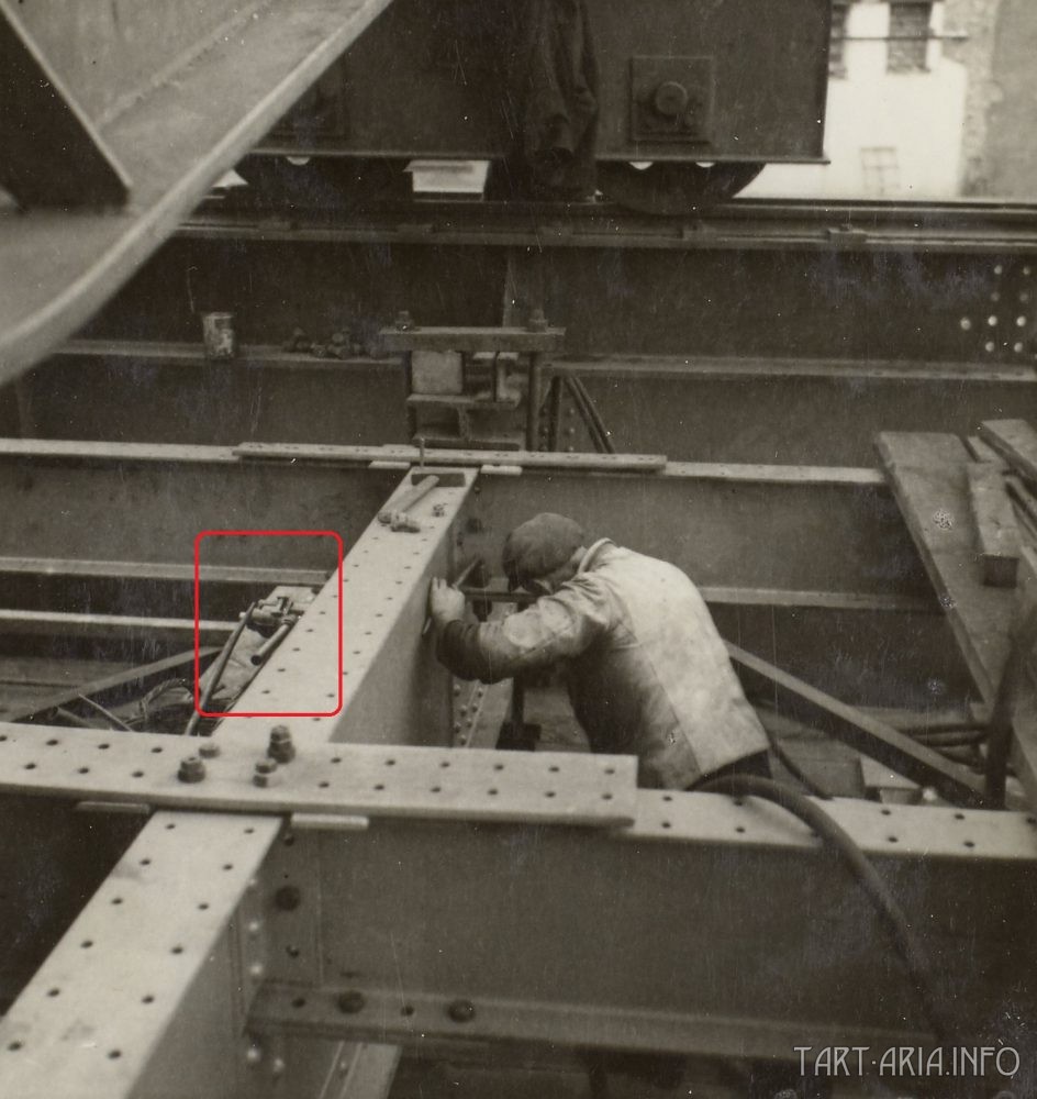 Это строительство пролётного сооружения в Германии, в конце 19 века. Что делает рабочий, а главное, что за волшебная машинка закреплена на противоположной стороне тавра? И на неё, как в колхозных мастерских при электросварке, положили лом для улучшения контакта. Наверное, это и есть та самая наковальня-поддержка, а лом положили случайно. Один случай - это всего лишь случай. Смотрим дальше.