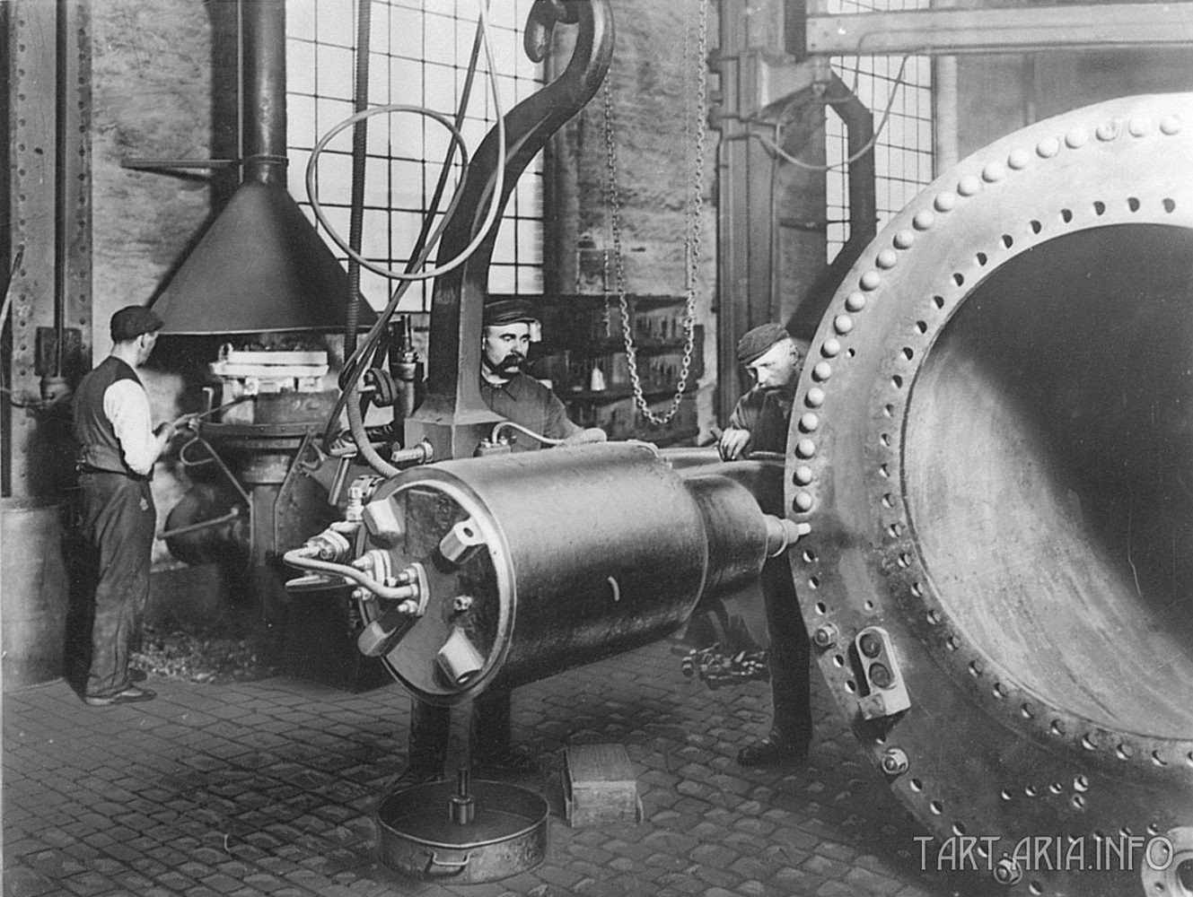Это фото из той же серии. Несмотря на то, что есть ряд незабитых клёпок, их размер наводит на мысли. Неужели такими молотками можно забить клёпки такого диаметра? Полагаю, нет (специалисты, поправьте). Для сравнения, приведу фото из 20 века от заводов Круппа в Германии, где давят клёпки с аналогичным диаметром.