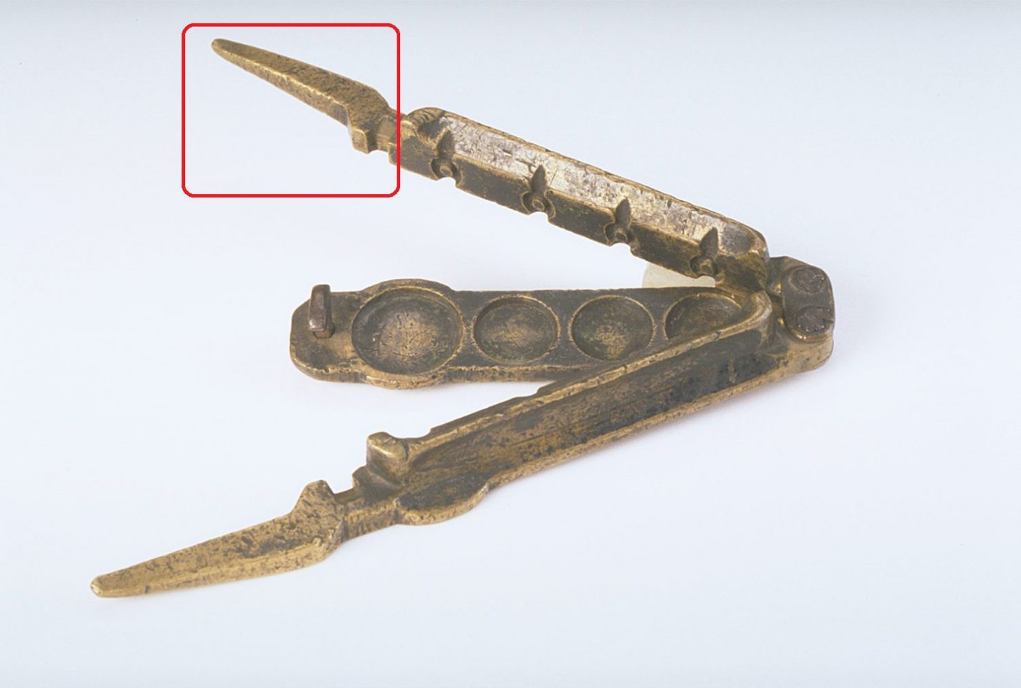 Эта вещь называется кнопкой клепальщика и датирована 19 веком. Во избежание путаницы проверил с портновскими принадлежностями, оказалось, в 19 веке на одежду кнопок не ставили. И даже с подобными портновскими инструментами от 20 века никакого сходства нет совсем. Что это за штука? В английском языке (на сайте аукциона) этот предмет называется button (кнопка), во французском bouton, а в русском это просто бутон. Да-да, тот самый, цветочный, только лепестков всего два. Очевидно, в центре этого бутона пристёгивалось нечто, от чего отходил бронешланг. При нажимании на это нечто замыкался какой-то контакт, как в кнопке, и наша клёпка в центре этого устройства начинала плавиться. От электрических токов, наведённых в ней самой, ясное дело. Это же энергетика прошлого. И далее, её достаточно было придавить усилием обычного человека. А всё же, неужели обведённый фрагмент даже сейчас ничего не напоминает?