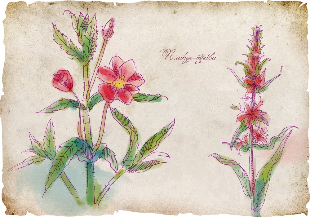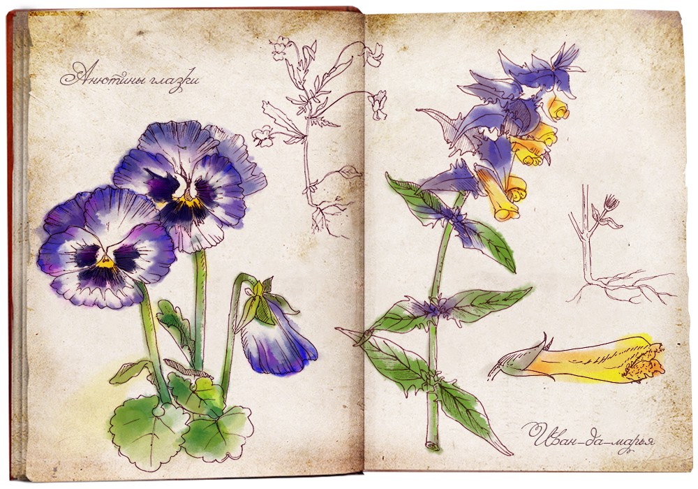 Такими же необыкновенными свойствами обладают и другие растения…Трава Мария-Магдалина помогает от тоски, Анютины глазки от сглаза, Иван-да-Марья и донник — от порчи, разбой-трава — от застоя крови, богородская трава — от порчи колдуна и домового, когда он ночью наваливается на спящего, просвирки или проскудки, если их настоем моются девки — способствует росту волос.