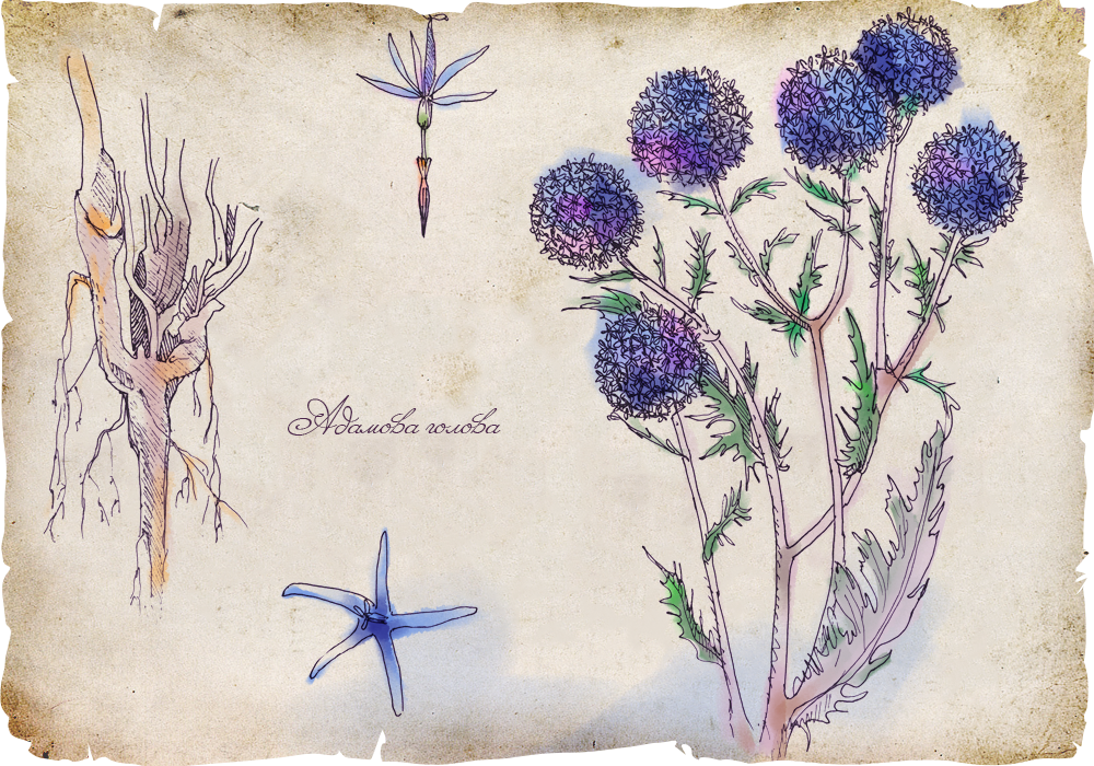 Часто в травниках упоминалась адамова голова. Считалось, что растение служило атрибутом колдунов и знахарей, его собирали ранним утром на Ивана Купалу. По поверьям, корень адамовой головы помогал увидеть затаившуюся нечисть, а человек, употребивший настой, «увидит», на ком лежит порча. Траве приписывали много чудесных свойств: она облегчала тяжелые роды, внушала храбрость воинам и помогала заживлять раны. Плотники брали ее с собой на высотные стройки церквей и палат, чтобы преодолеть страх высоты. Адамову голову вшивали в одежду для защиты от болезней или носили на цепочке на шее. Корень травы освящали святой водой, клали в церкви на 40 дней, а после носили с собой как оберег.
