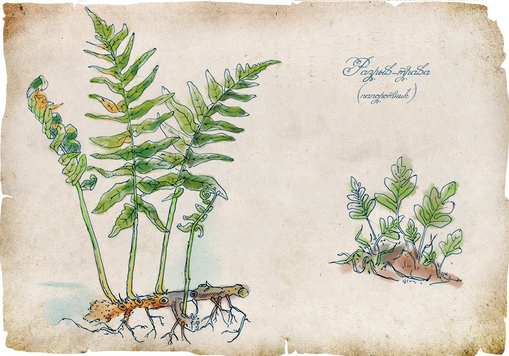 Если на ту траву скованная лошадь найдет — железа спадут; если подкованная наступит — подков вырвет из копыта… А рвать ее так: если где соха вывернулась или лошадь расковалась, то по зорям выстилай на том месте сукно, или кафтан, или епанчу, или что-нибудь, лишь бы чистое, — и она выйдет насквозь».