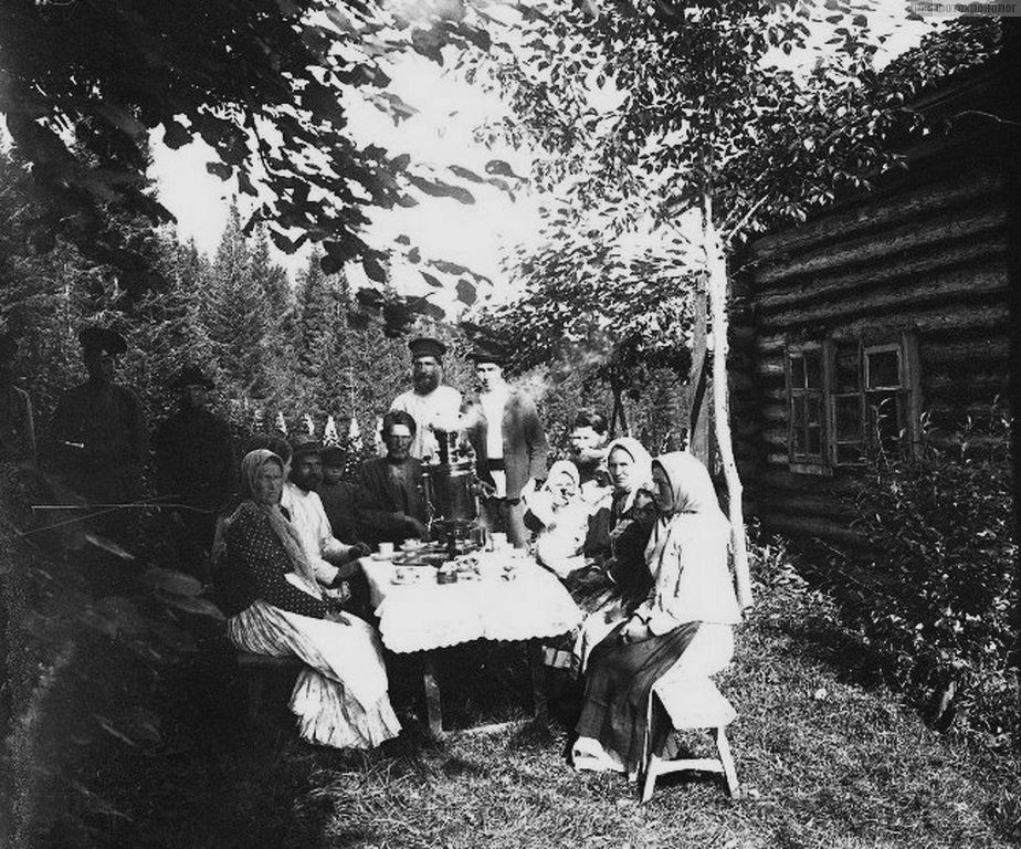 Крестьянская семья за чаепитием. Русские. Кировская обл., Богородский р-он, Сытени д. (Вятская губ., Глазовский уезд). 1913