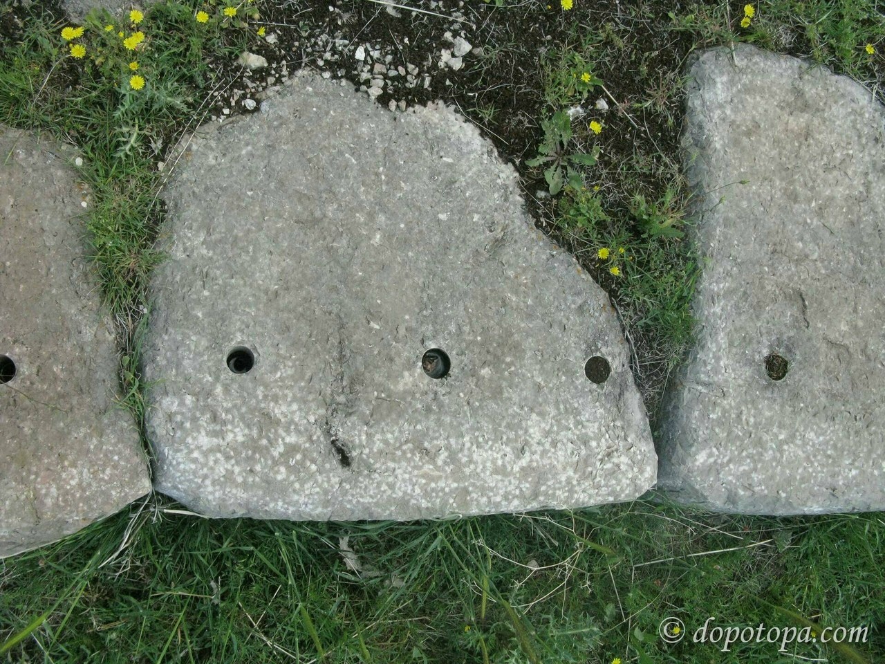 Можно предположить, что эти отверстия – это крепления блоков через металлические штыри. Что через них крепился бордюр, идущий по краям каменной дорожки.