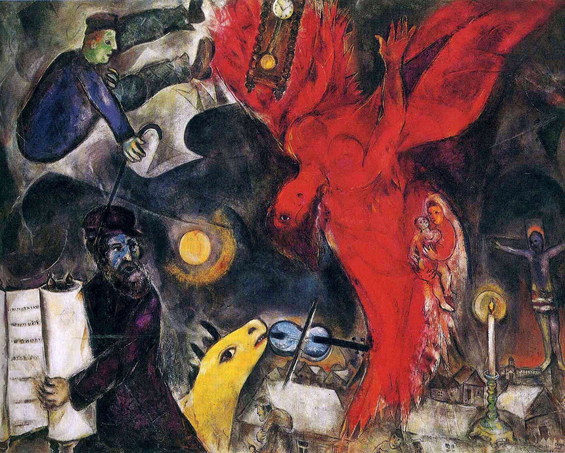 Творчество авангардного художника Марка Шагала отличалось тем, что его картины являлись носителями ощущения принадлежности к национальной еврейской культуре. Об этом говорят сюжеты, изображенные на его картинах. Также стилистические приёмы художника являлись следствием визуализации древнееврейских поговорок, для которых он пытался подбирать подходящие, запоминающиеся образы.