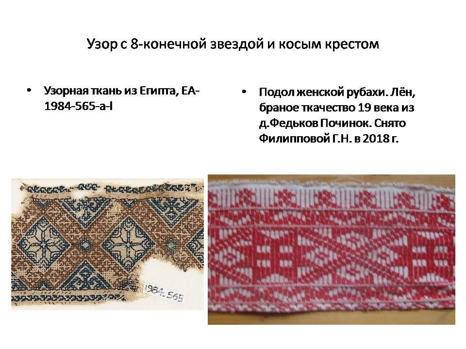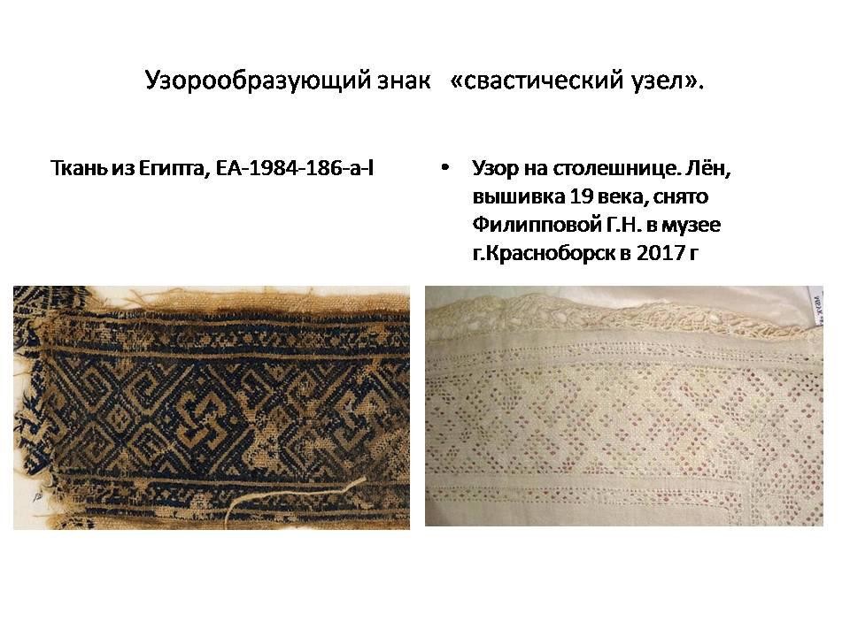 Какие выводы из этого можно сделать? За ответом мы обратились к начальнику ОНИР Смольного института Российской Академии Образования, кандидату культурологи, действительному члену Петровской Академии науки и искусств, члену Русского Географического общества, уважаемому исследователю русской народной культуры Павлу Ивановичу Кутенкову: «Каким образом оценивать обнаруженные идентичности и близкую родственность узорочья египетских и северных великорусских тканей, выявленную в ходе первичных исследований? Наша позиция здесь состоит в следующем. Мы признаём возникновение каких-либо идентичных единичных знаков в каждой культуре, у каждого народа – самостоятельно. Это очевидные явления. Вместе с тем, обнаруженные идентичности и схожести столь точны по мелочам и столь множественны по количеству обнаруженных явлений, что в совокупности со способами получения узоров, цвета узоров, ткани носителя узоров – всё вместе указывают на их возникновение из единого истока. По нашим данным ими могут быть древнейшие славяно-арийские культурные корни. При этом наибольшая древность узорочья сохранена в тканях Русского Севера».