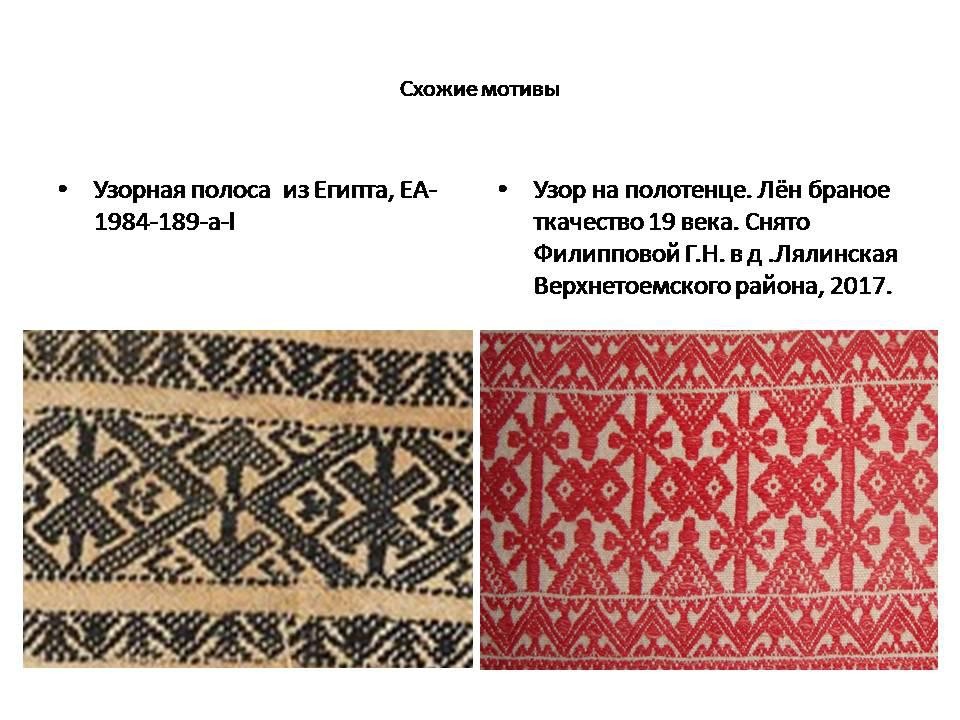О различиях нужно сказать следующее: наши узоры выполнены нитями красного цвета в технике браного ткачества на домашнем ткацком стане. Египетские узоры вышиты шёлковой нитью синего, зелёного, коричневого, редко красного цвета. Но в обоих случаях использовалась льняная ткань полотняного переплетения.