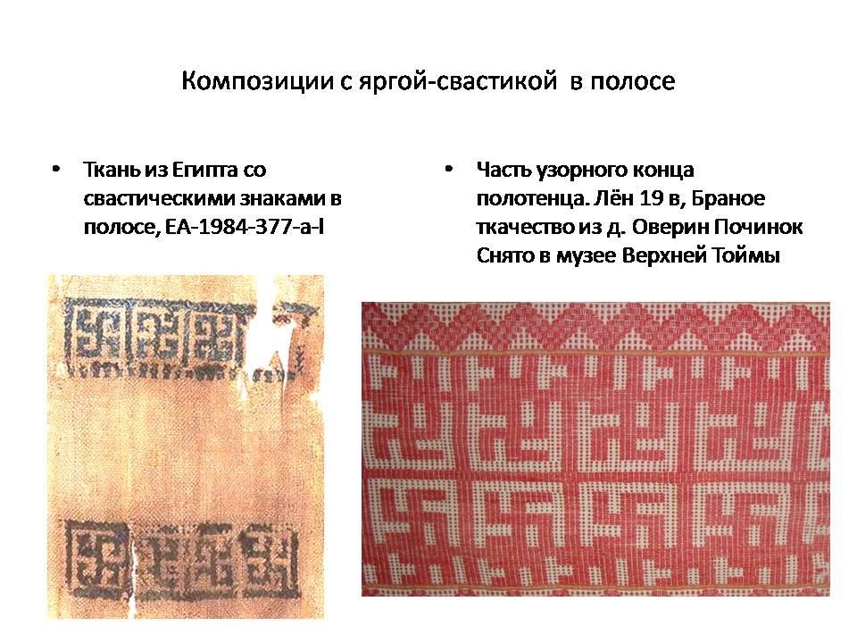 В египетских экспонатах многое показалось очень знакомым: и структура построения композиции, и узорообразующие знаки, и образы, и даже верхние каёмочки праставок. Всё это узорочье широко известно у нас на Русском Севере и обычно украшает праздничные обрядовые полотенца, свадебные подзоры на кровать, узорные пояса, подолы и оплечья рубах.
