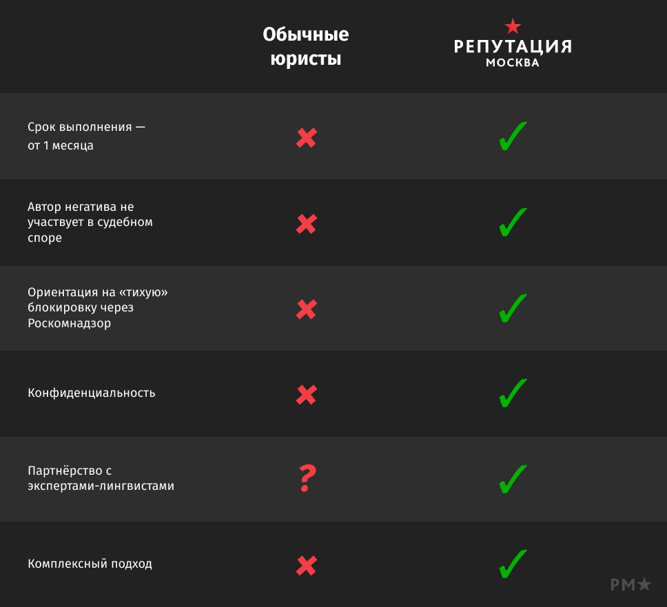 Агентство «Репутация.Москва» более 5 лет помогает клиентам решить сложные репутационные проблемы, в том числе — легально удалить негатив. Обычно это происходит в досудебном порядке, но если необходимо, можно получить решение суда.