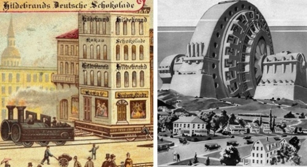 Немецкая компания по производству какао и шоколада Theodor Hildepand & Son, помимо создания профилирующей продукции выпустила серию открыток для коллекционеров с их видением будущего. В этом конкретном примере автор и его заказчики мечтали, что в будущем можно будет перемещать огромные здания и даже целые города. Причем транспортировать их будут с помощью гигантских платформ, которые смогут тянуть поезда.