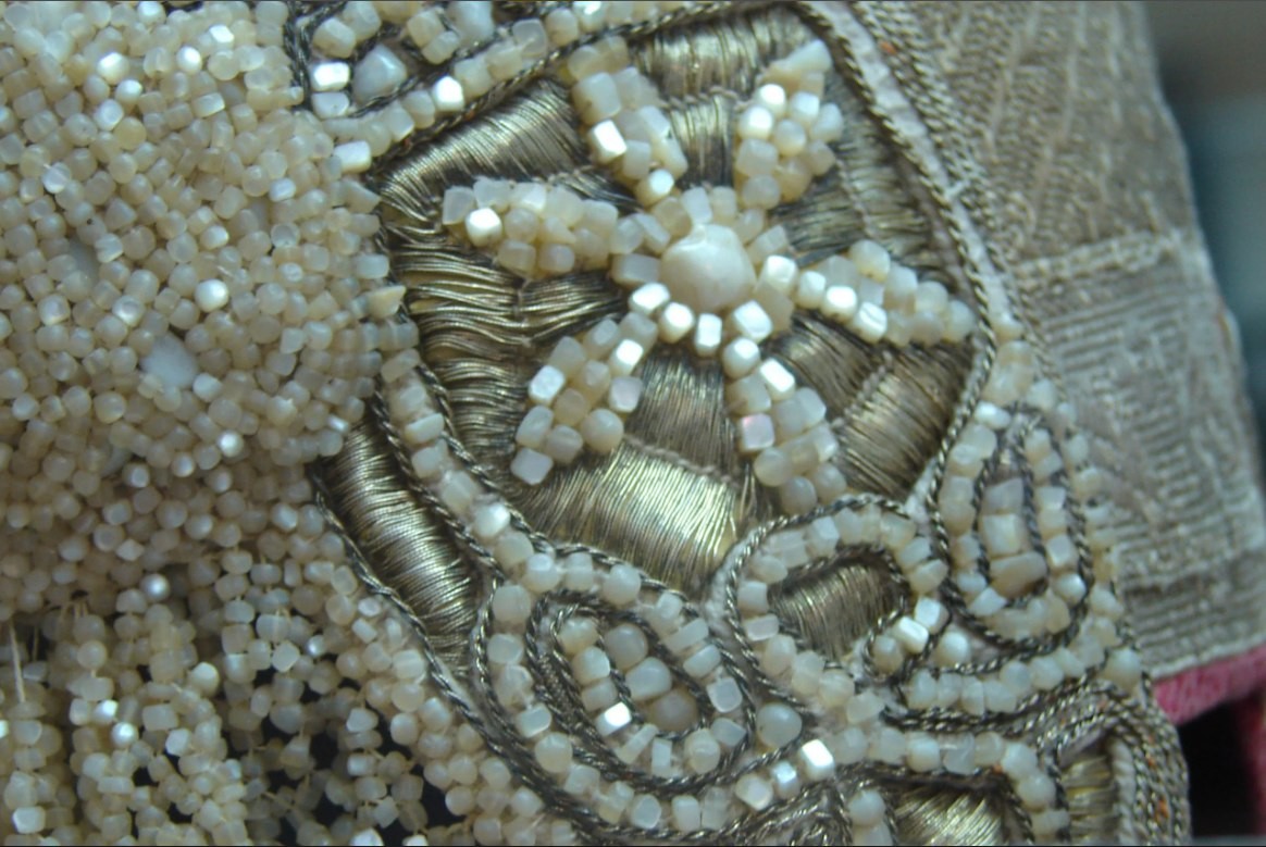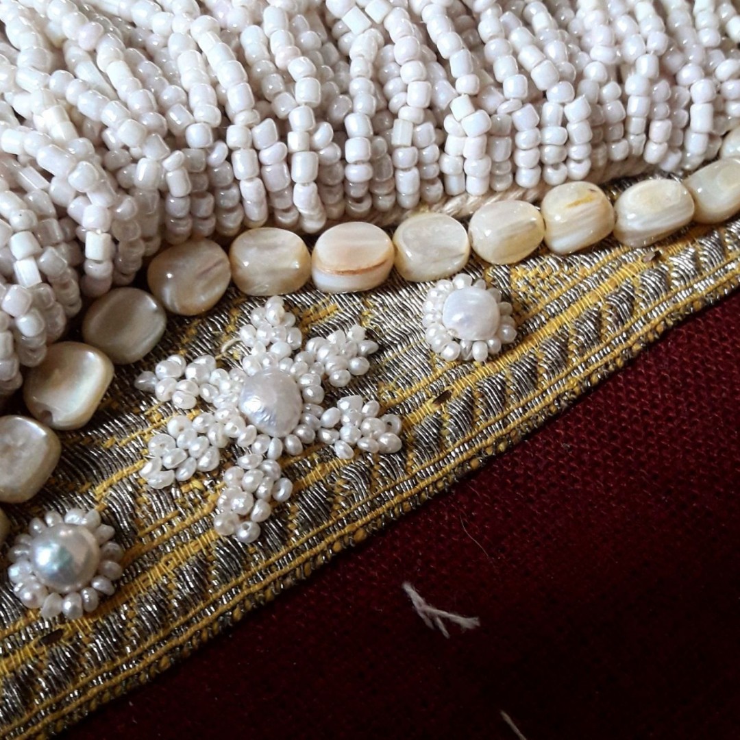 Золотный галун, мелкий речной жемчуг, перламутровые плашки, рубленый перламутр.