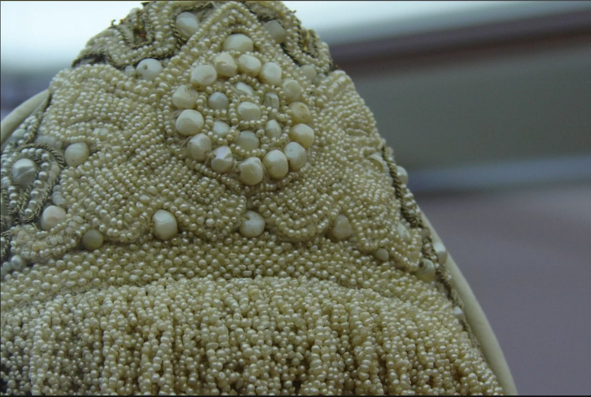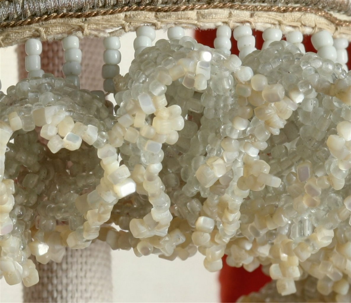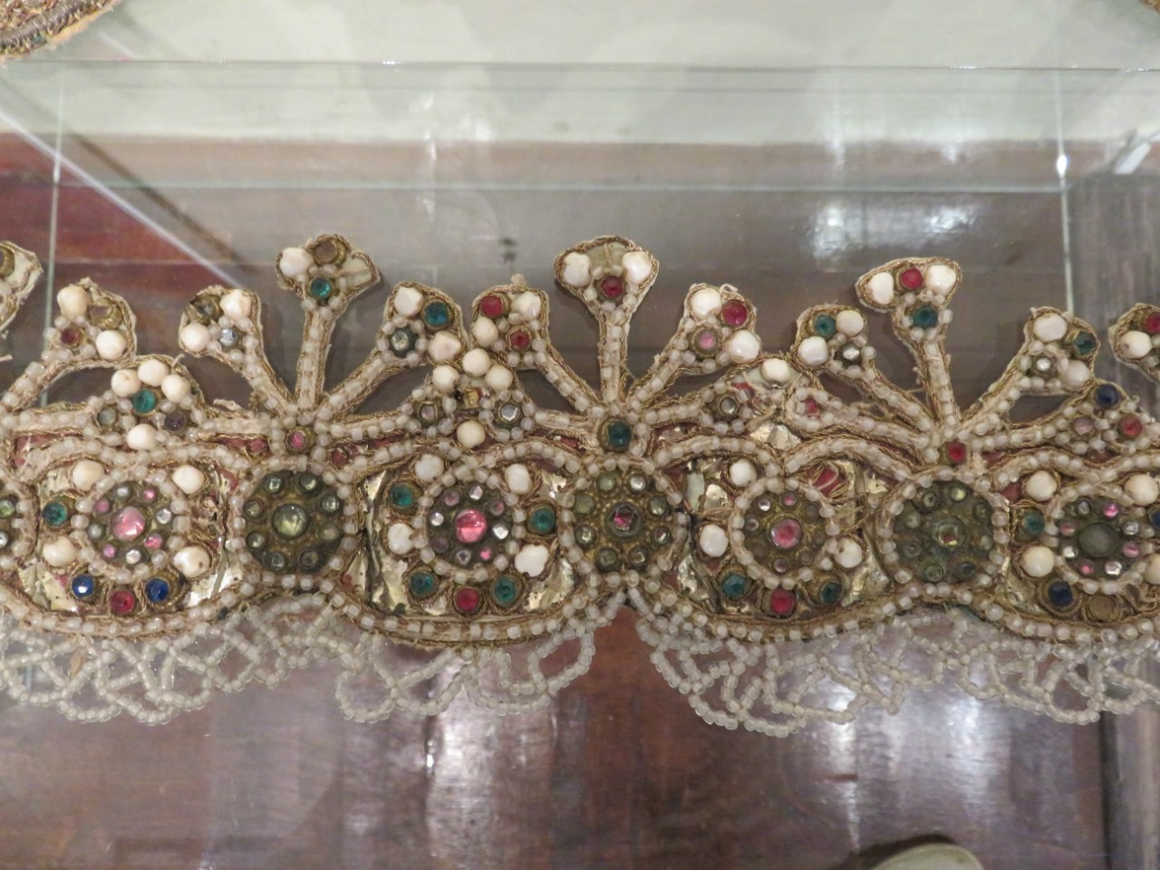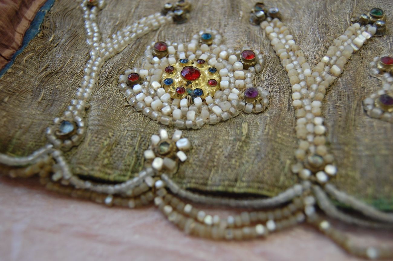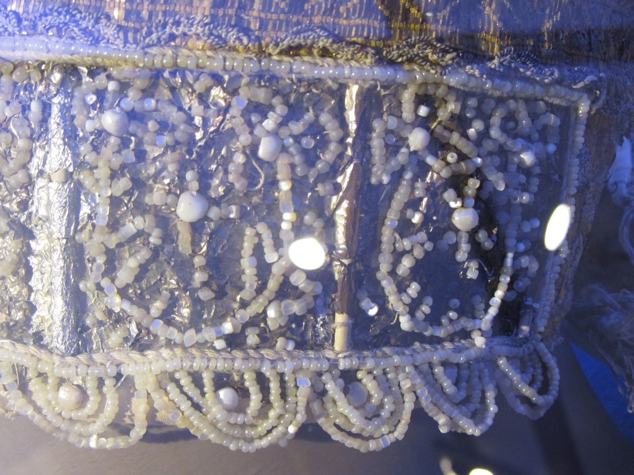 Материал, техника: ткань шелковая, тесьма х/б, жемчуг речной, окатный перламутр, хрусталь, цветные стекла в металлических кастах, картон, нити х/б, сажение по бели, шитье.