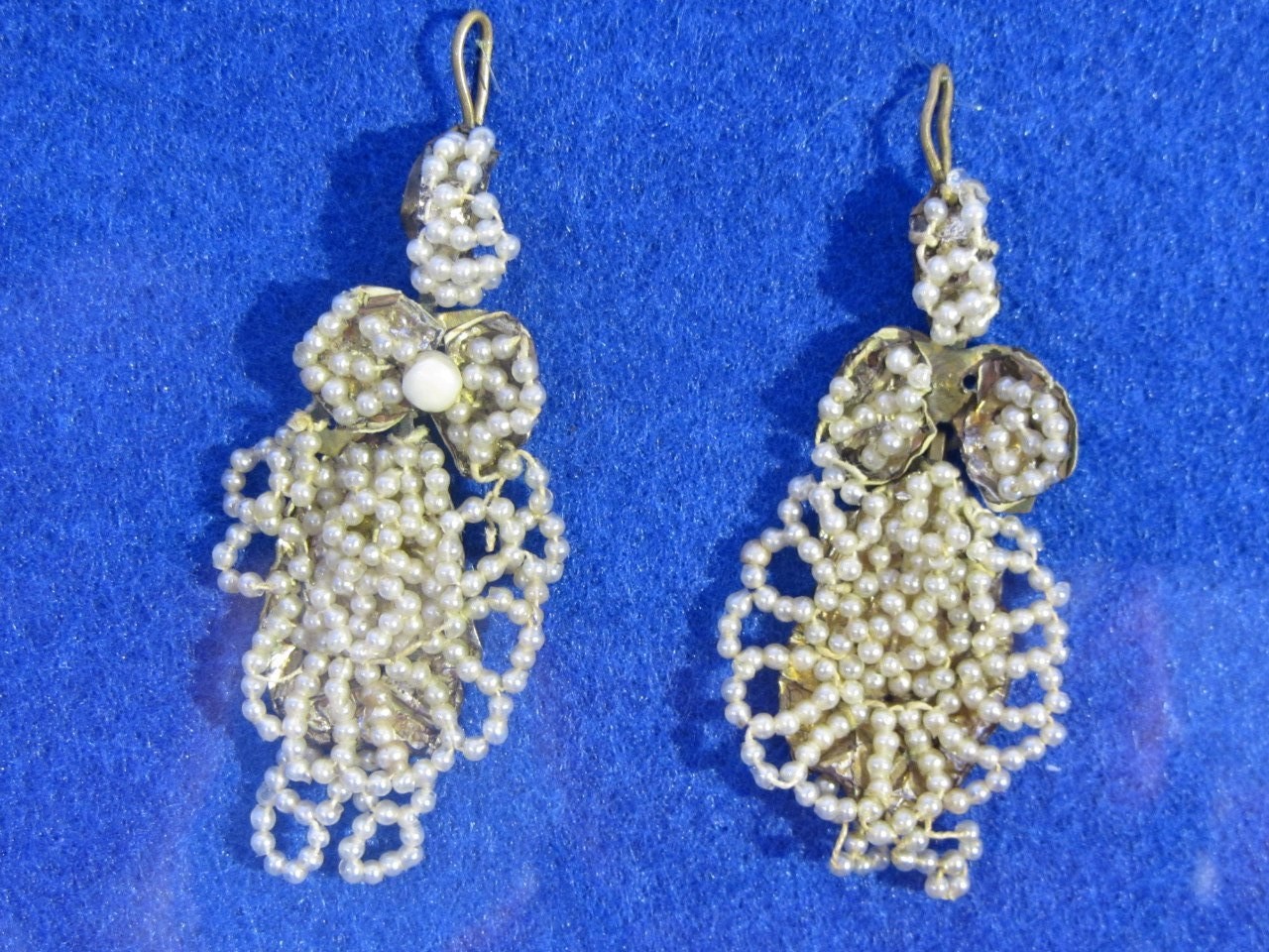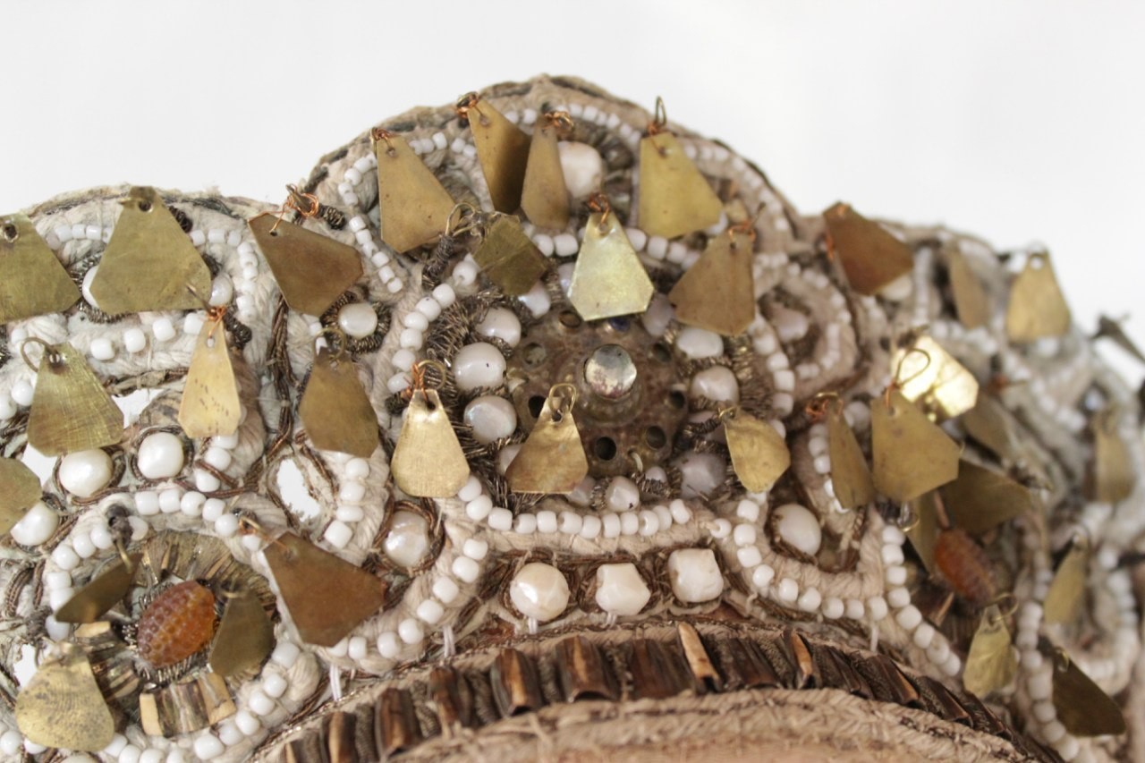 Поднизь к праздничному головному убору в виде ажурной сетки из мелкого речного жемчуга нанизанного на конский волос и проволочный каркас. Лобная часть из полосы галуна. Сзади завязки.