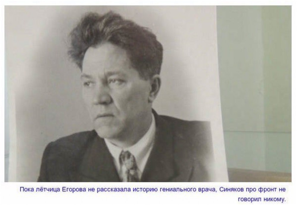 А ещё Синяков изобрёл лекарства, которые затягивали раны, хотя сами ранения при этом выглядели свежими. Эту мазь он наносил Анне Егоровой. Легендарную лётчицу фашисты сбили под Варшавой в 44-м. По сводкам Совинформбюро прошла информация о присвоении Егоровой, совершившей более трёхсот боевых вылетов, звания Героя Советского Союза посмертно. Никто не знал, что обгоревшая «летающая ведьма» попала в плен и оказалась в концлагере. В том самом Кюстрине, где у операционного стола стоял Синяков. Гитлеровцы ждали, когда та поправится, чтобы устроить показательную казнь, а лётчица всё «угасала и угасала».