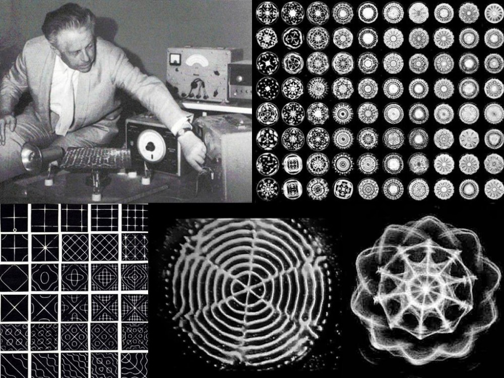 Он насыпал песок, жидкость или какой-либо порошок на металлическую пластину, которую прикреплял к осциллятору. По сути, осциллятор это вибратор, но в данном случае прибор контролировался генератором, способным производить многие тысячи видов частот. Некоторые из них можно встретить в природе, а другие создаются человеком.