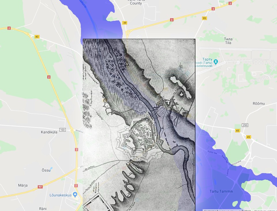 Любопытно, что план осады Дерпта 1704 г. из «Военной энциклопедии» составлен вопреки принятым правилам, и сориентирован по сторонам света так, как это делали до потопа. Тогда, подобно знаменитой карты мира монаха Фра Мауро, многие чертили карты «вверх ногами», когда сверху юг, а слева восток. При наложении этого плана на реконструкцию, получается очень убедительная картина, подтверждающая правомерность версии о том, что Тарту, как и Вильянди, были портами на одном водном пути из Балтики в Псковское Озеро.