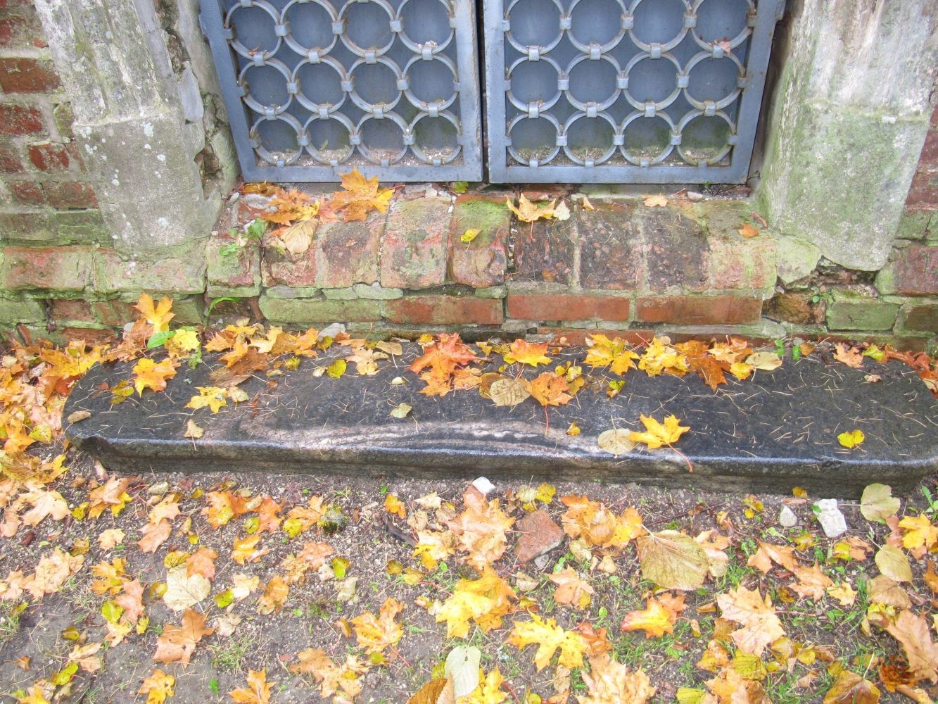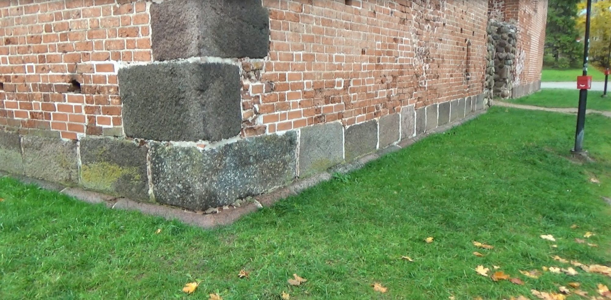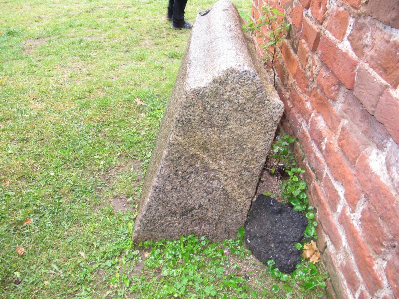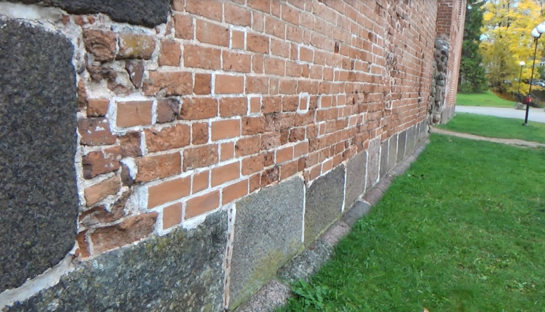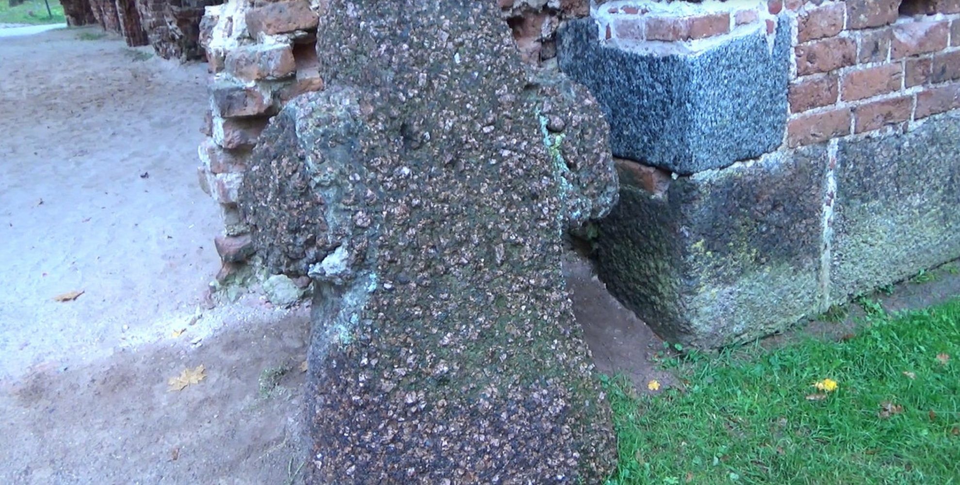 На фото отчётливо видно, что гранитные блоки, из которых сложен фундамент резко контрастируют с кирпичом, положенным на них. Часть блоков была напилена и изначально, скорее всего, была отшлифована, но в силу того, что местный гранит очень низкого качества, за несколько десятков или сотен лет он полностью утратил свой былой лоск.