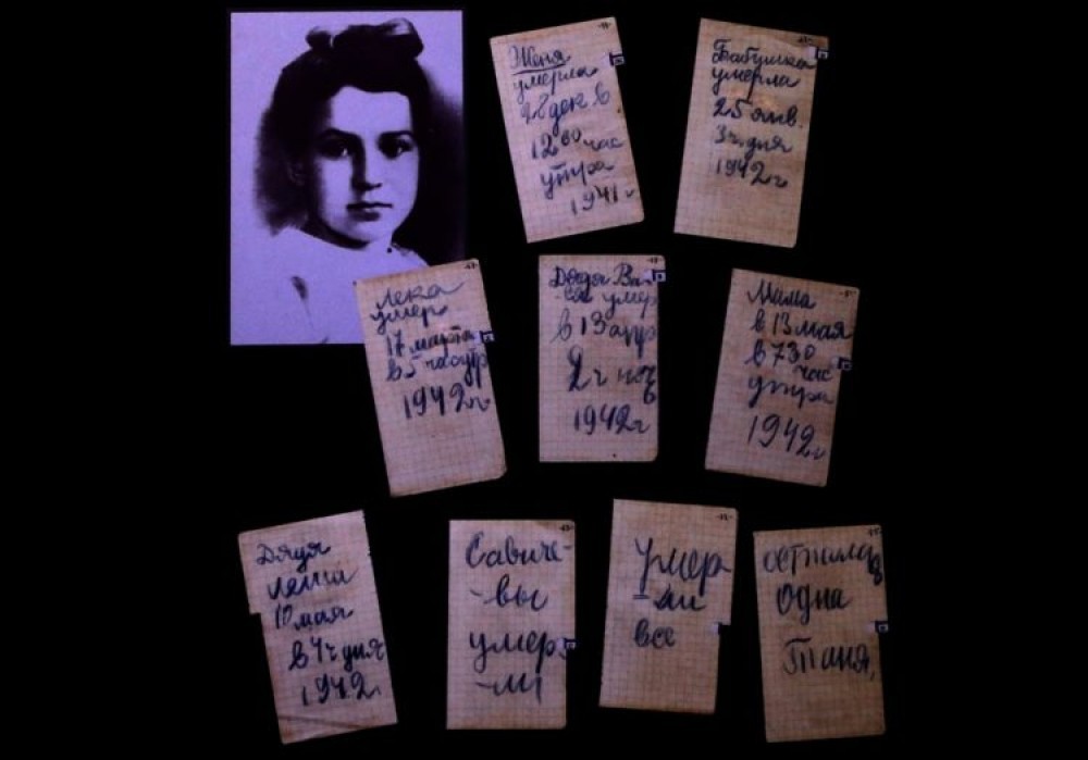 «Женя умерла 28 дек в 12.00 час утра 1941 г.», — эта запись на букву «Ж» стала первой в записной книжке Тани Савичевой. Ее она сделала после смерти старшей сестры. И продолжала записывать даты смерти остальных родственников, используя соответствующие буквы: «Б» — бабушка, «Д» — дяди, «М» — мама. Дневник заканчивается записями «Савичевы умерли», «Умерли все» и «Осталась одна Таня», сделанными на страницах с буквами «С», «У» и «О».