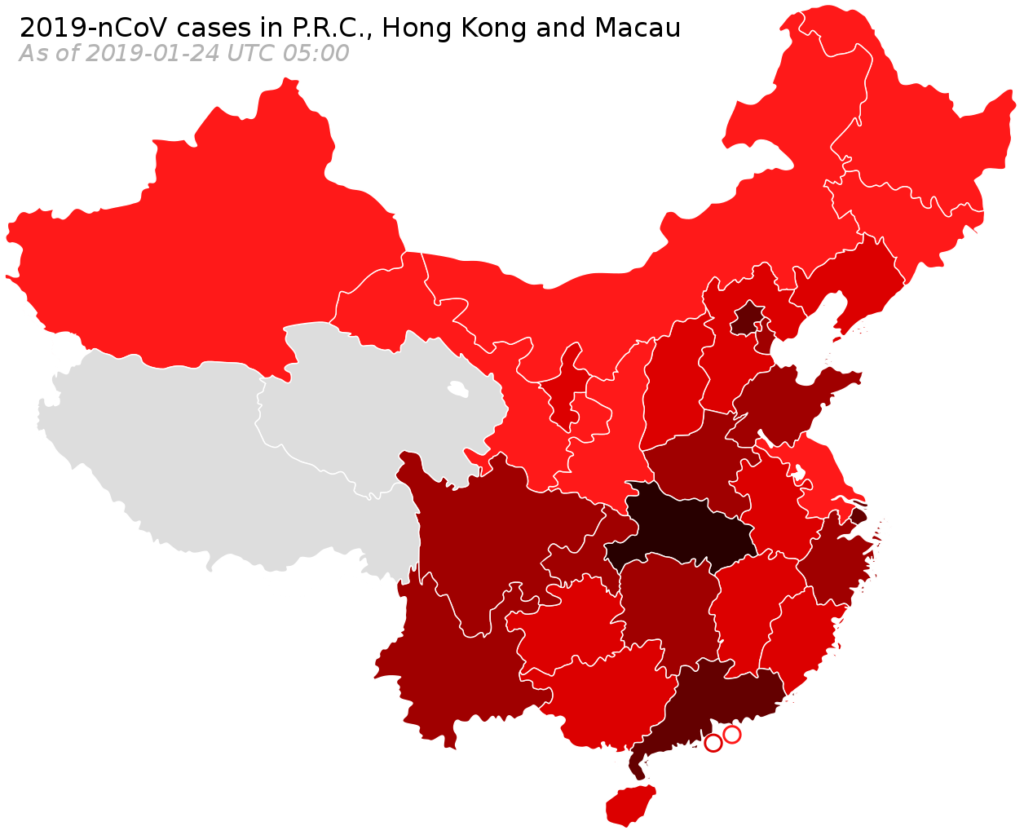 Карта распространения нового коронавируса 2019 года по регионам Китая. Черным показаны регионы распространения на 11 января 2020 года, более светлыми оттенками — на 20, 21, 22 и 23 января (чем позже, тем светлее). Географически распространение выглядит очень быстрым / ©Wikimedia Commons