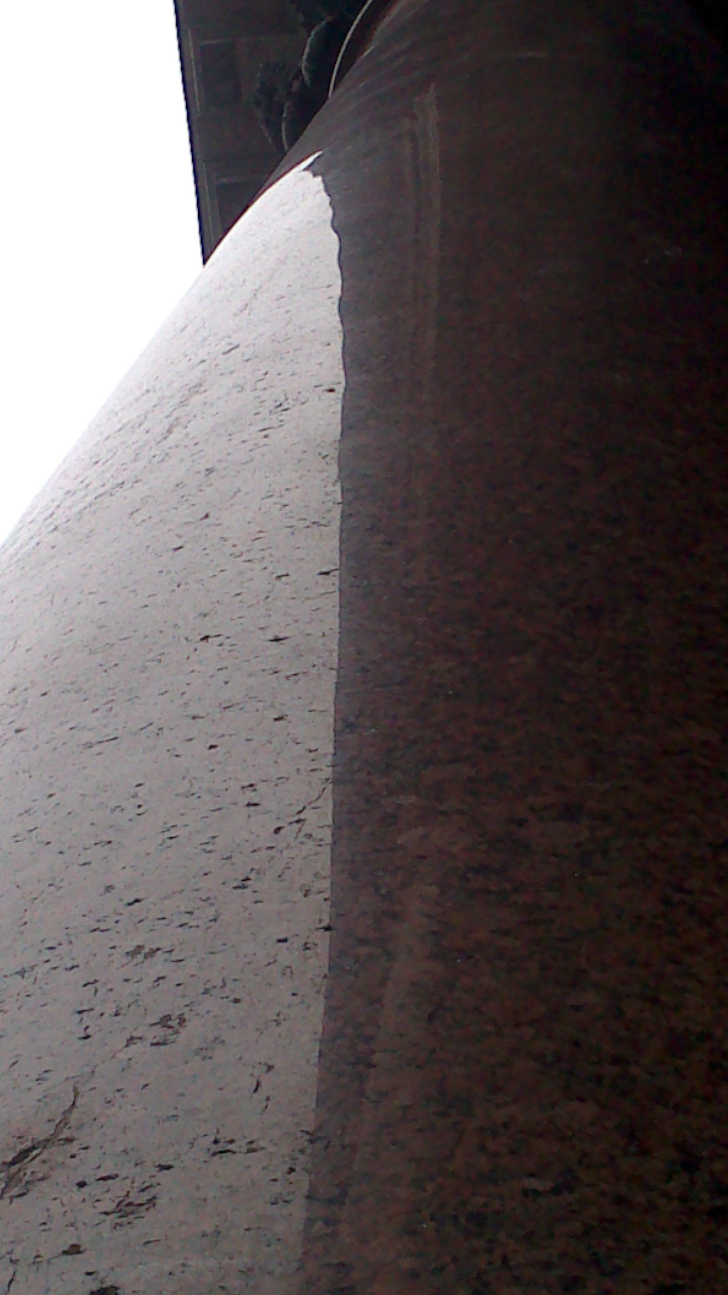 Что касаемо знаковых сооружений, которые так же с высокой степенью вероятности нужно относить к допотопным - Александровской колонне и Исаакиевскому собору, то тут несколько сложнее. Эти сооружения имели последующие реставрации, тем более что отполировать гранит можно когда угодно. Следы полировок на всех колоннах Исакия и на Александровской колонне налицо. Их прекрасно видно, особенно в солнечную погоду. Они в виде волнистости и сегментов - темных и светлых полос. Даже видно шаг с которым ходил полировальный агрегат. Но, есть и следы древности этих изделий. Вблизи очень хорошо видно, что колонны имеют каверны. Это следы эрозии. Каверны глубокие, настолько глубокие, что полировка не смогла их сгладить. Вернее могла бы, если бы пришлось перед полировкой колонны точить и шлифовать, но, видимо, этого не стали делать, ибо это подразумевало бы как минимум потерю изначальной геометрии (формы и объема) изделия. Каверны похожей глубины мы сможем легко найти на любом диком булыжнике в Финском заливе или в лесу. На гранитных колоннах на которые не было агрессивного воздействия окружающей среды никаких каверен мы не найдем. Ни внутри Казанского собора, ни в Эрмитаже, ни где-либо еще. Они идеально гладкие. На фото каверны колонны Исаакиевского собора и следы полировки. Кликабельно.
