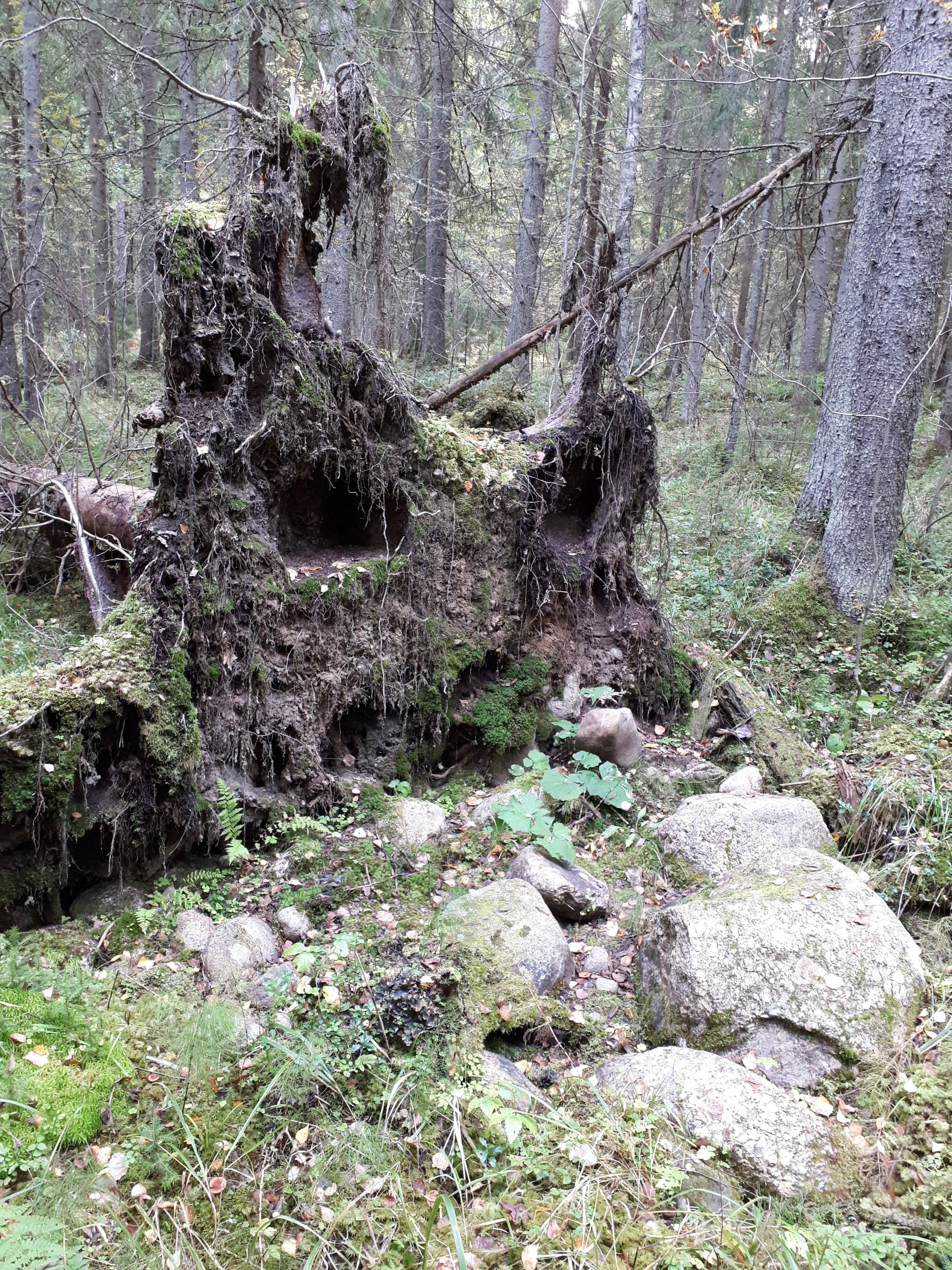 Далее. Почвоведение. По этой теме у меня несколько лет назад была специальная статья. Называлась На чем растут леса в окрестностях Петербурга. Подробная, с анализом. Вывод следующий. На территории Ленинградской области выше балтийского глинта (уступа) налицо толстый слой гумуса - до 0,4-0,5 м. А ниже балтийского глинта гумус как таковой практически отсутствует, всего 1-3 см, локально до 5-10 см. Учитывая скорость нарастания гумуса можно предположить что еще 400-500 лет назад этот участок суши был морским дном. Для примера фото на чём собственно растёт лес. Фото кликабельны.
