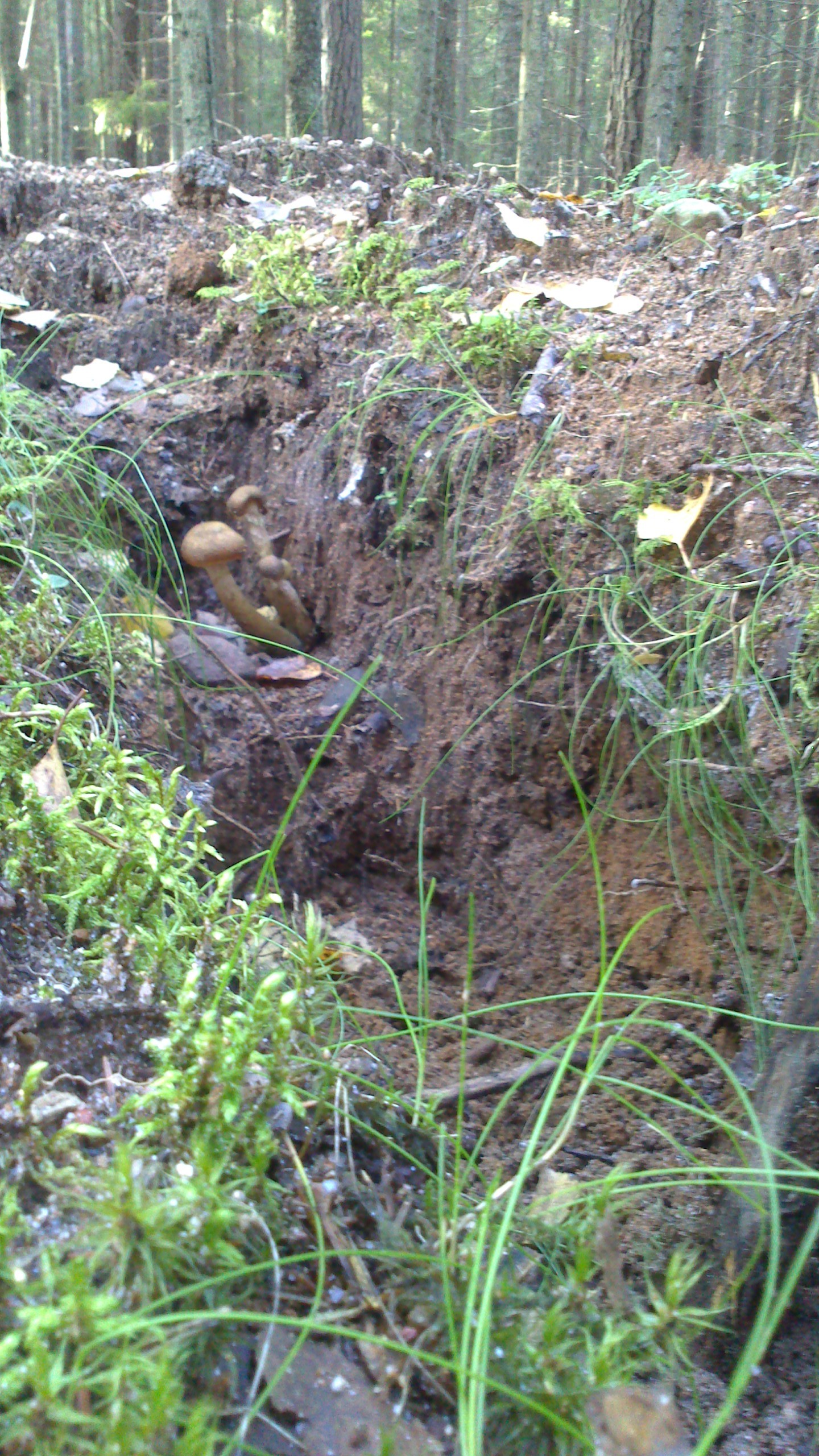 Опята способны расти прямо в песке. Это борозда от трактора который делал противопожарные канавы. Вообще много удивительного узнаешь. До того как я серьёзно увлекся историей, стал внимательнее смотреть на мир и вообще полез в дебри, многие вещи мне и в голову не приходили, а если бы кто-нибудь сказал что грибы, тем более опята, могут расти на песке, никогда бы не поверил.