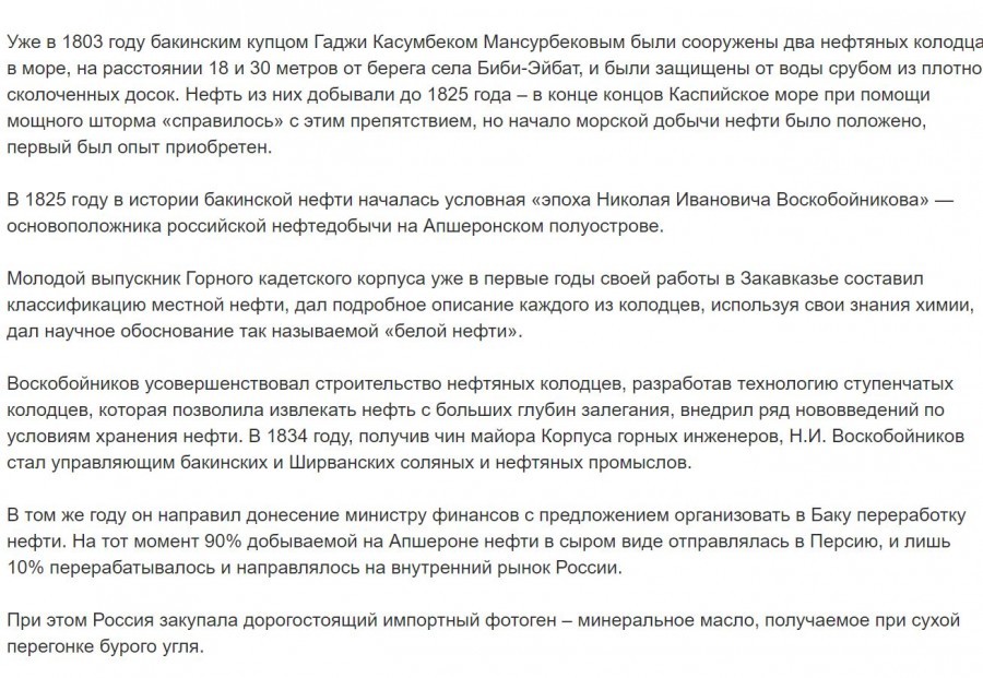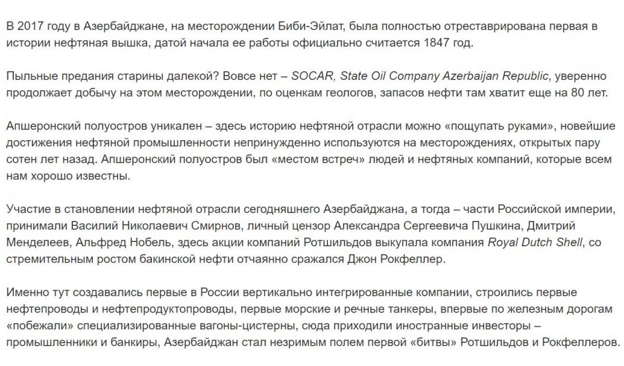 Конечно, данная статья не претендует на полноту обзора, об истории азербайджанской нефти написано немало отличных книг, соперничать с которыми просто невозможно.