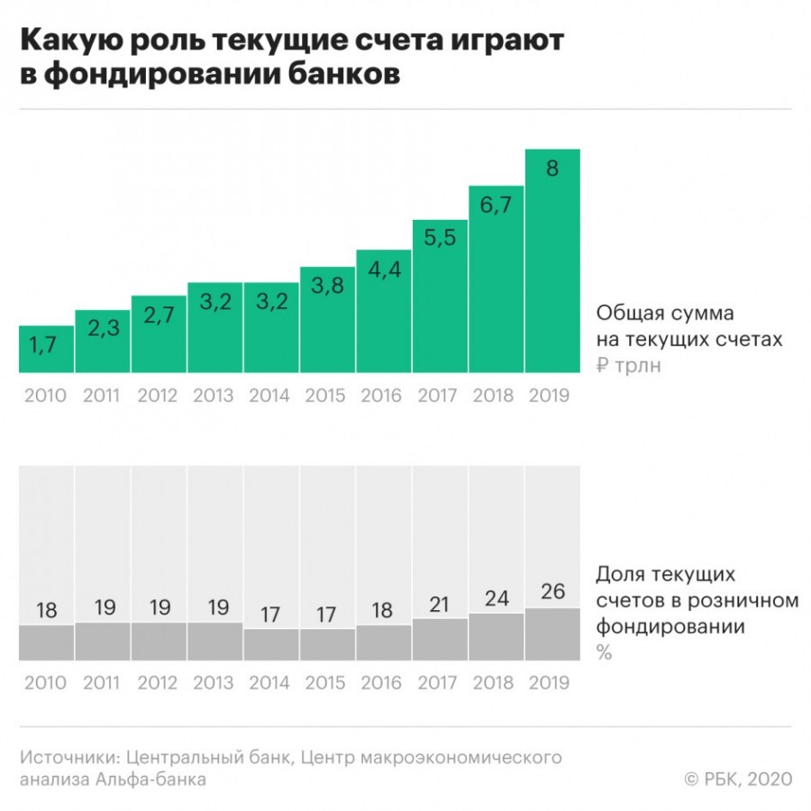 Доля средств физических лиц на текущих счетах в российских банках в 2019 году достигла 26% от всего объема привлеченных розничных ресурсов — это рекорд как минимум с 2010 года, говорится в обзоре аналитиков Альфа-банка (есть у РБК). В абсолютном выражении объем средств на текущих счетах достиг 8 трлн руб., что на 19,4% больше остатков по итогам 2018 года. За последние три года объем сбережений россиян на текущих счетах практически удвоился.