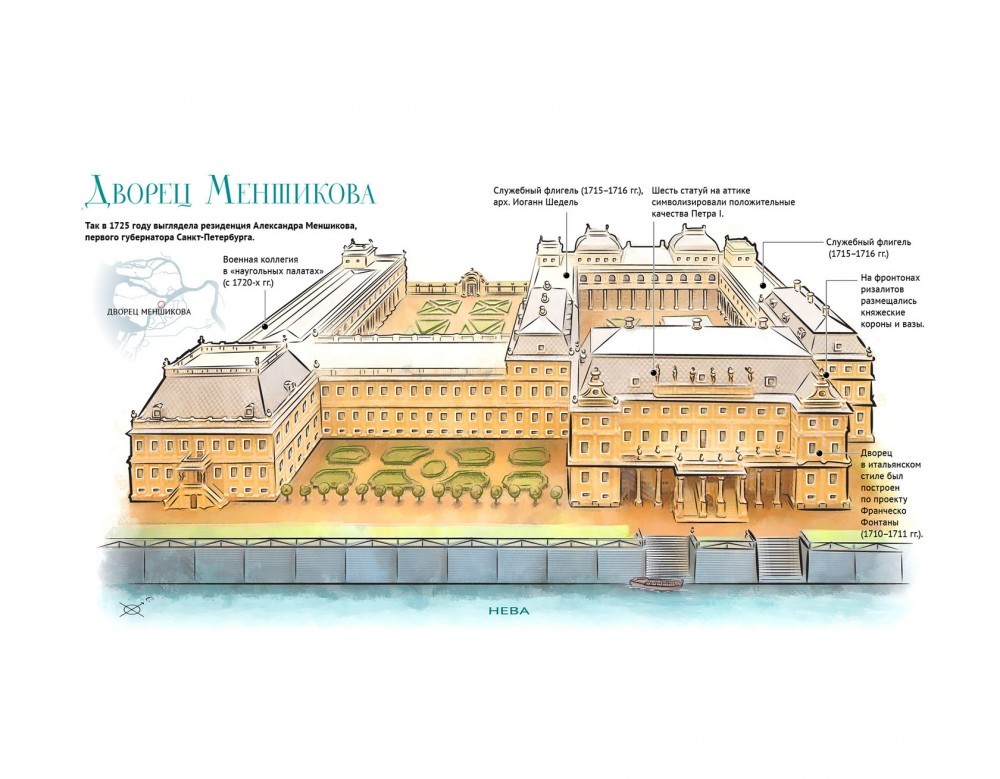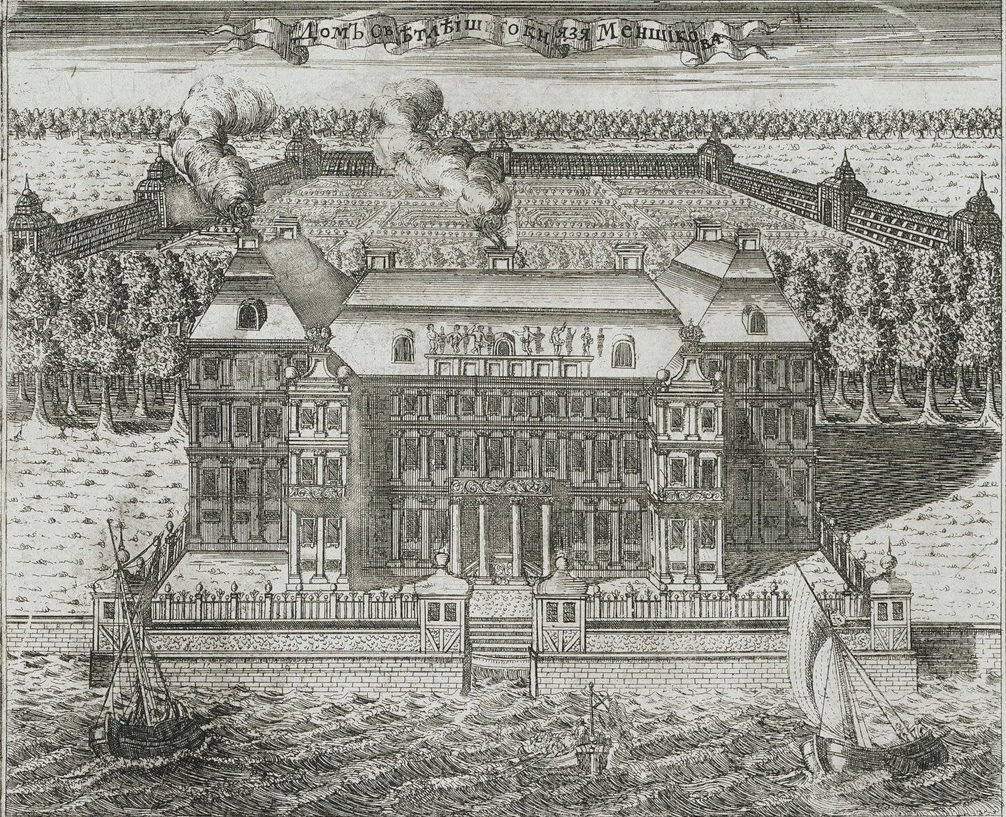 1. Меньшиков никакой дворец не строил. А прихватизировал и восстановил то что досталось в наследство от старого допотопного города. Никакой нормальный человек никогда в жизни не будет строить дом у которого двери ниже уровня реки по соседству. При этом которая еще и повышает уровень от малейшего ветерка с залива. И никакой нормальный человек не будет делать парадный вход через второй этаж, если есть возможность проектирования и строительства дома с нуля.