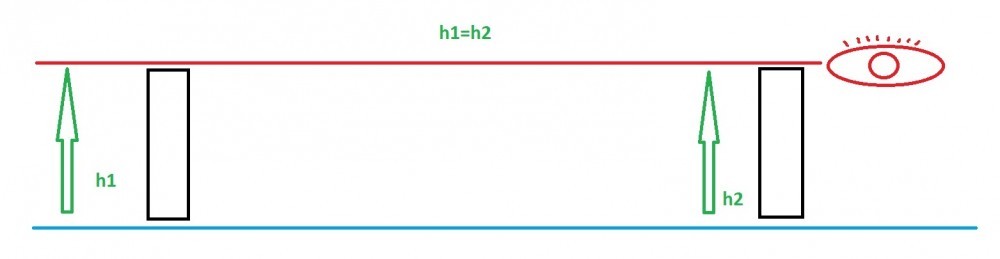 Голубой линией я обозначил условный горизонт. В нашем случае он привязан к уровню Невы. Черные прямоугольники это любой предмет, в нашем случае это будет гранитная набережная. При условии равенства черных прямоугольников величины высоты h1 и h2 будут тождественны на всем протяжении взгляда. Именно по-этому все художники детей и людей меньшего чем художник роста рисуют ниже условной линии горизонта, и высоких людей выше этой самой условной линии горизонта. Надеюсь объяснил понятно.