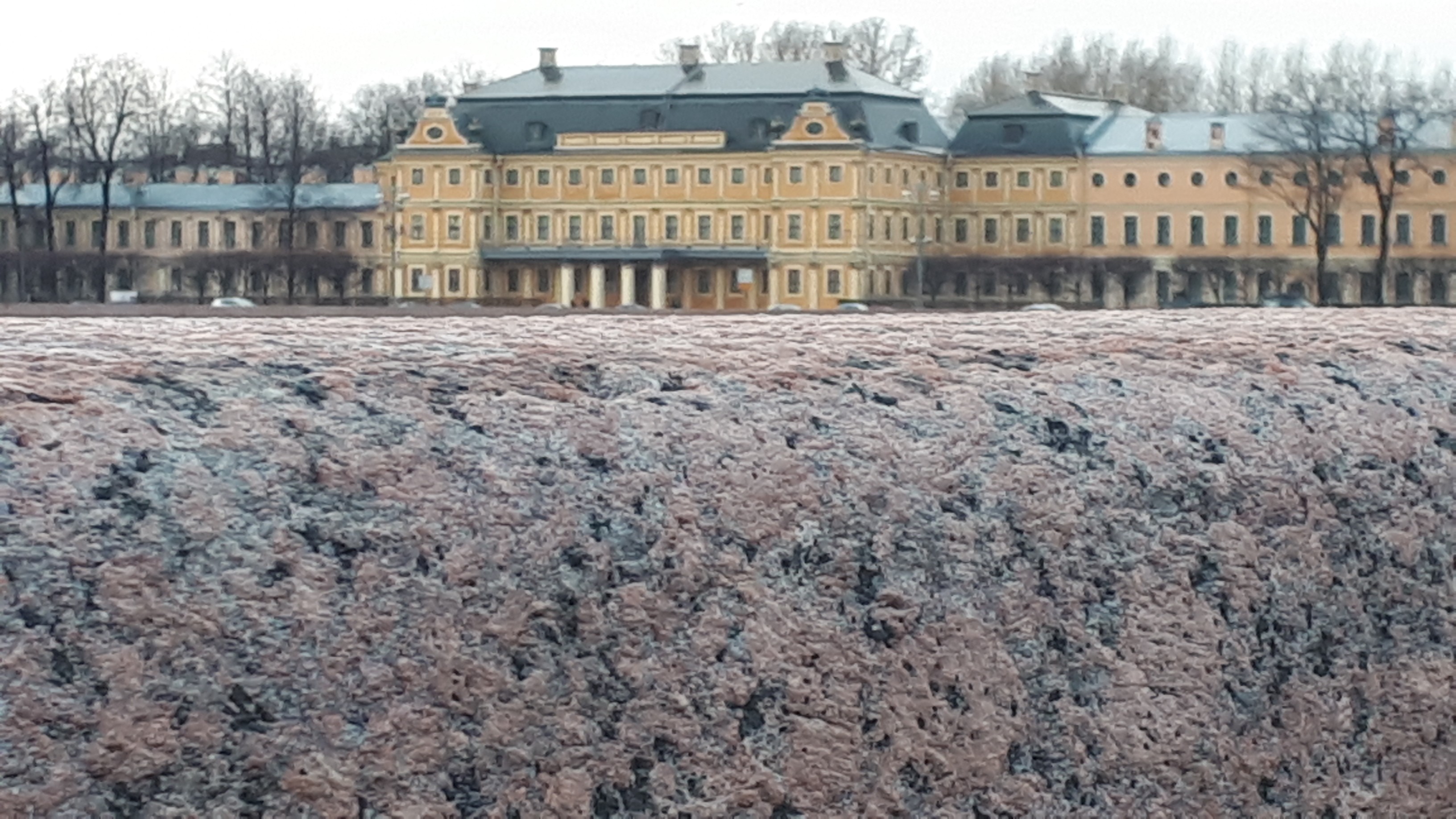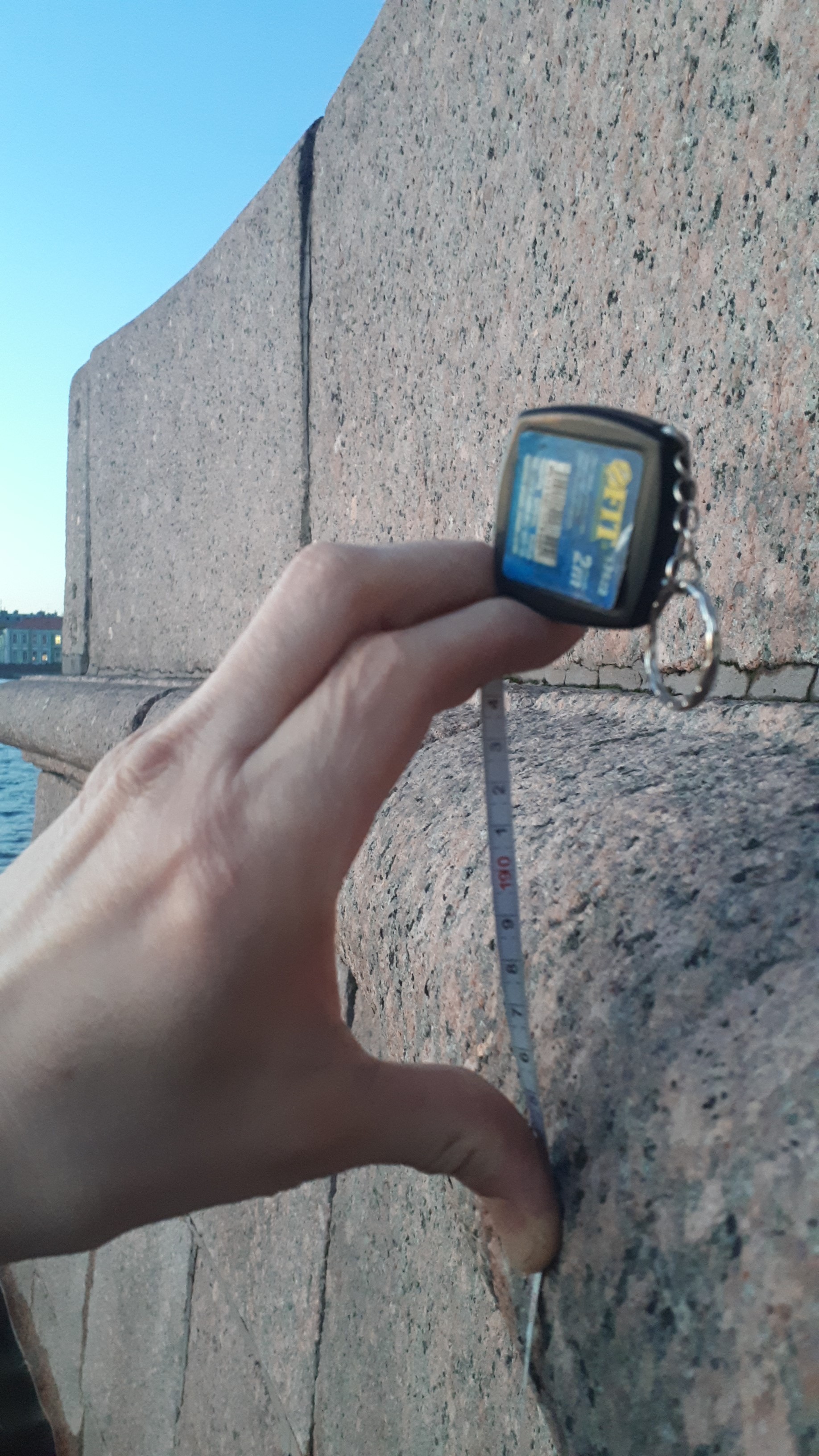 Точно так же замеряем на противоположном берегу напротив Меньшиковского дворца. Это у нас будет h1. Там уровень парапета на всём протяжении вдоль дворца немного гуляет по высоте в пределах 10-12 см. В самом начале от уреза воды до края парапета порядка 276 см, поодаль где-то 273, где-то до 284 см. Начало парапета как раз где синяя курточка. Слева оранжевый - это дворец Меньшикова.