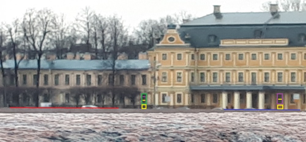 Вот первое фото. На дальнем плане желтый - это дворец Меньшикова. Замеряем величину h2.