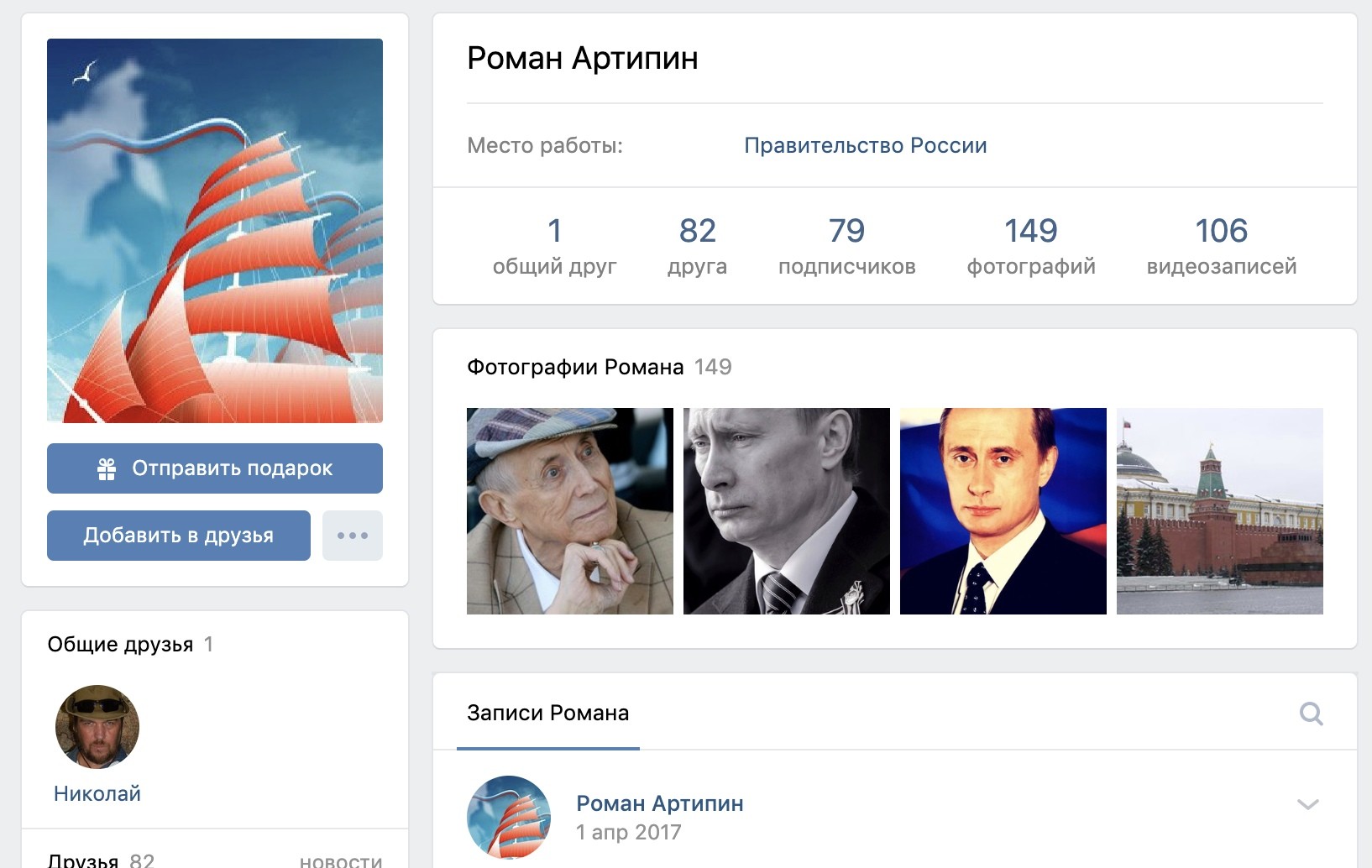 А вот его предыдущая страница, видимо пароль от которой он потерял. Видим тот же кораблик на аватарке и, пропитанную патриотизмом и фотографиями нашего президента, стену.