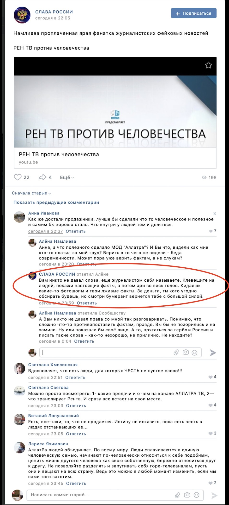 Видим группу патриотического содержания, но вдруг, тут появляется контент с ресурса Аллата ТВ. Который повествует о том, какие журналисты продажные и рен-тв плохое. Посмотрите на эти комментарии. Сейчас Вы этого в группе уже не найдёте, сегодня утром они всё зачистили. Видимо, стало просто стыдно.