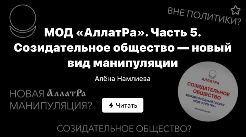 Это было предсказуемо, но мало кто мог даже подумать о таком— МОД «Аллатра» переходит в другой статус. Сомнительной оккультно-мистической организацией решено создать партию «Созидательное общество». Да не какую-то там очередную и невзрачную, каких немало, а уникальную и мирового масштаба. Так написано на официальном сайте движения в их очередной статье: