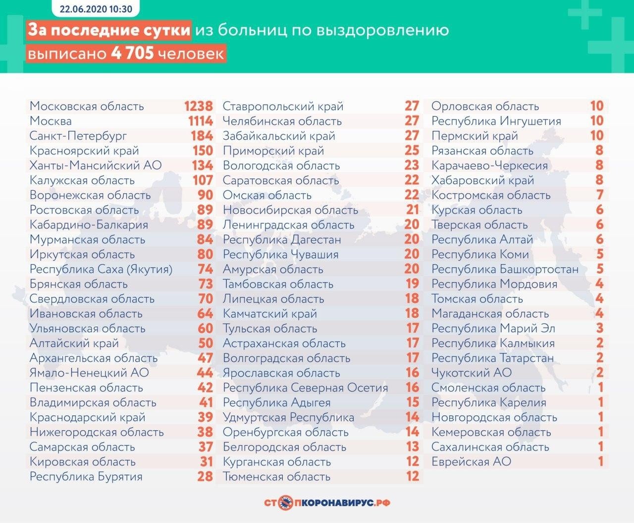 Кроме того, из больниц выписали за сутки 4 705 человек. Общее число выздоровевших от болезни - 344 416 пациентов.