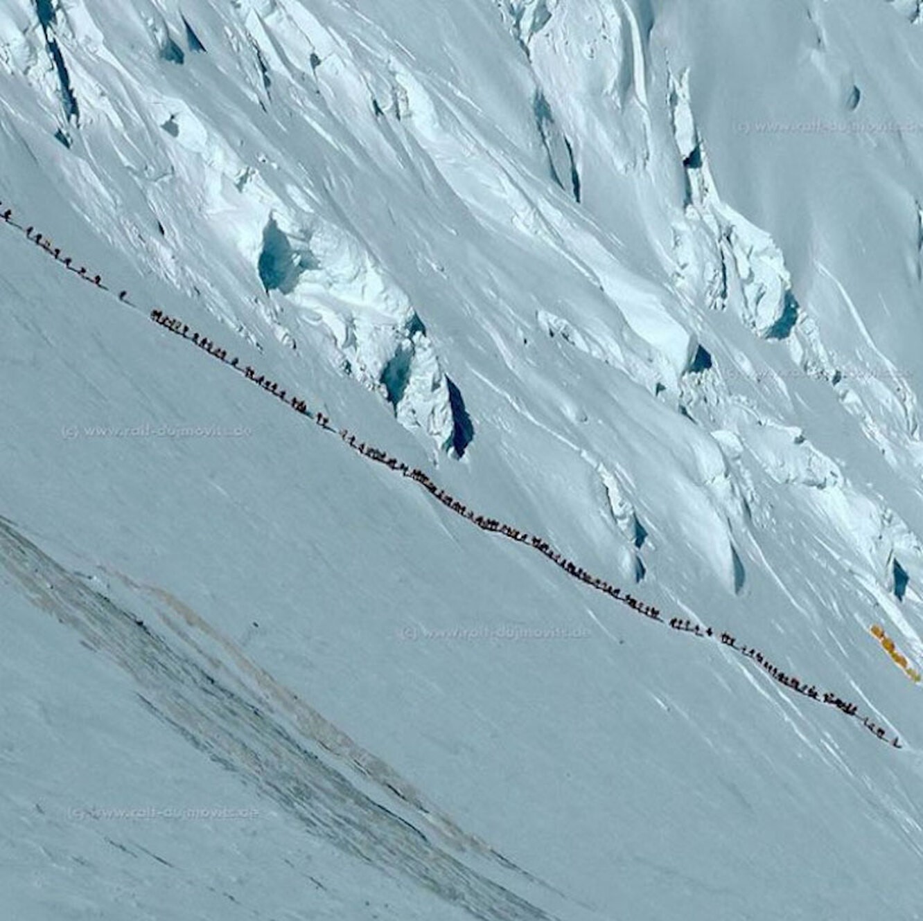 Очереди на вершину Эвереста — не новое явление. Эта фотография с вереницей людей была сделана в конце мая 2012 года опытным немецким альпинистом Ральфом Дужмовицем. Тогда за выходные на Эвересте погибли четыре человека.