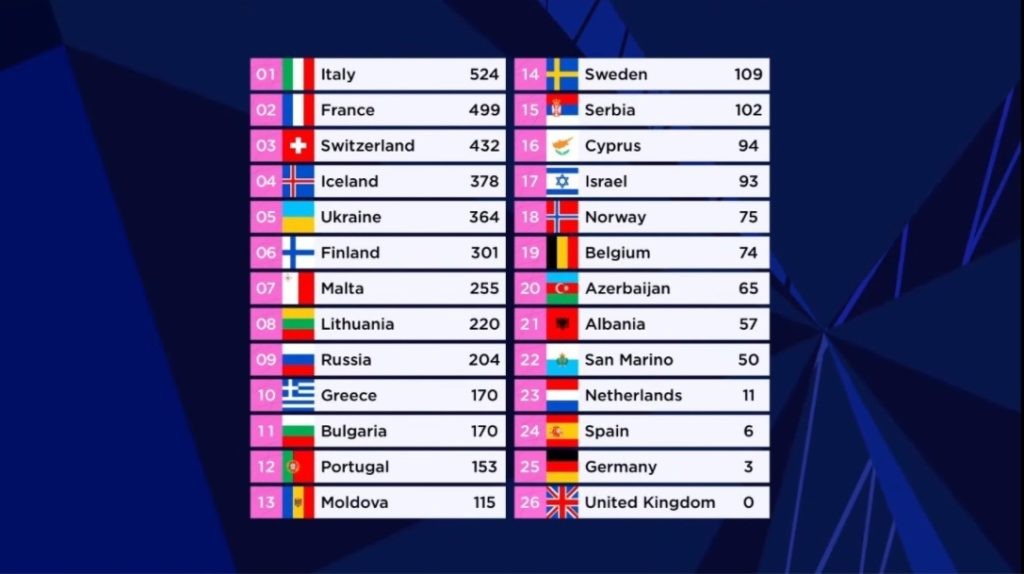 На официальном портале «Евровидения» появилась информация о распределении голосов. Победителем конкурса выбрали Италию. Группа под названием Maneskin, которая представляет жанр рок, набрала 524 балла и расположилась на первой строчке. Франция набрала 499 балла. Стоит отметить, что Франция называлась явным фаворитом конкурса. В тройке лидеров нашлось место для Швейцарии, она набрала 432 балла.