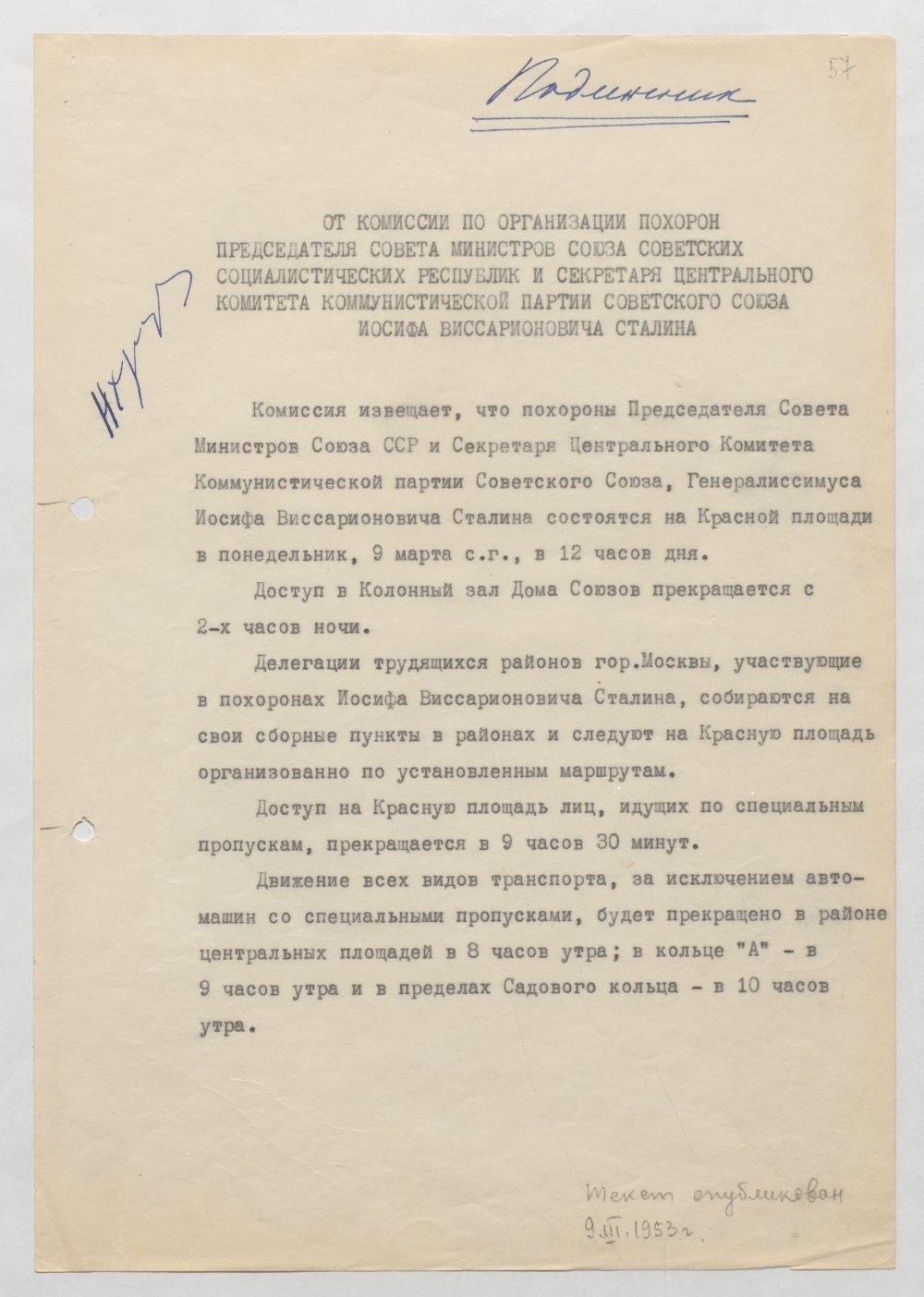 Полный титул Сталина был такой: секретарь Президиума ЦК КПСС и председатель Совета министров генералиссимус Иосиф Виссарионович Сталин. О смерти вождя СССР узнал из официального информационного сообщения в шесть часов утра 6 марта.