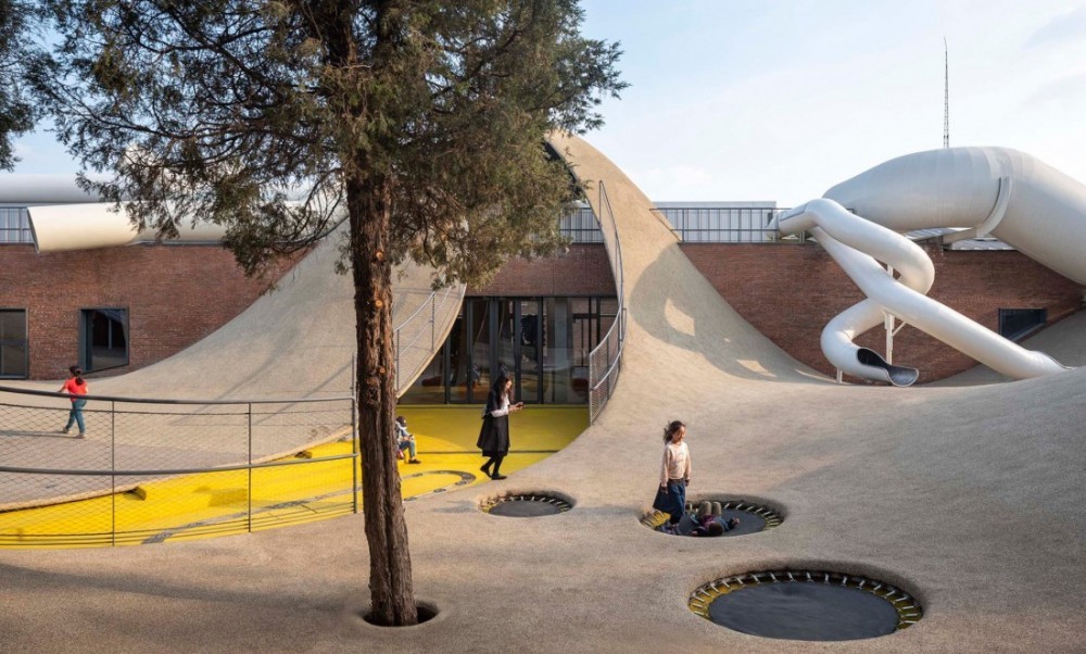Волнистая крыша образует своего рода марсианский ландшафт, заинтересовывая детей бегать, играть и общаться (YueCheng Courtyard Kindergarten, Пекин).