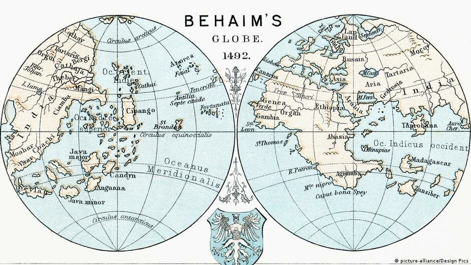 Самый старый глобус из сохранившихся артефактов назывался "Земным яблоком", его создал немецкий ученый, торговец и мореплаватель Мартин Бехайм (Martin Behaim, 1459-1507). Он получил этот заказ, так как долгое время провел в Португалии и был хорошо осведомлен о последних португальских географических открытиях. Америки на глобусе еще нет!
