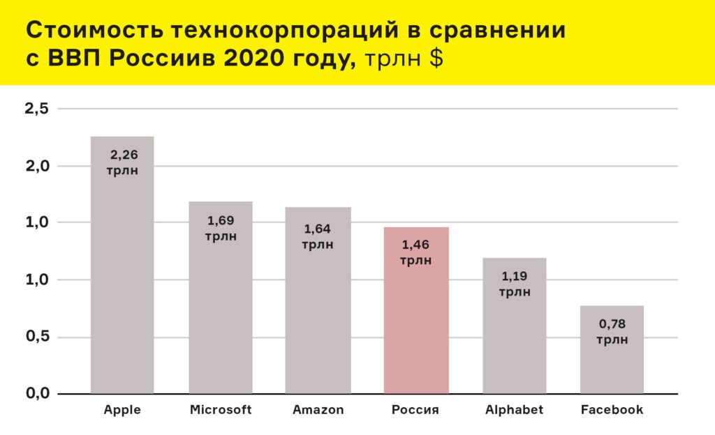 Пандемия коронавируса потопталась по экономикам всех стран мира, но для Больших технологий она оказалась золотой порой: в 2020 году суммарная стоимость пяти крупнейших американских IT-компаний перевалила за $7,5 трлн — это в пять раз больше ВВП России.
