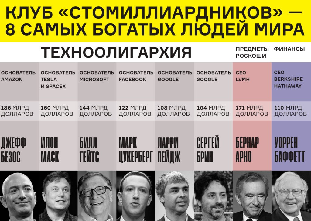 Пандемия породила «клуб стомиллиардников» (раньше в мире еще не было людей с таким количеством денег) и почти все участники этого клуба — техноолигархи. Безос даже стал единственным членом клуба владельцев двухсот миллиардов долларов, пусть и ненадолго. Впрочем, ему предсказывают статус первого в истории человека с триллионом долларов, так что спешить ему некуда.