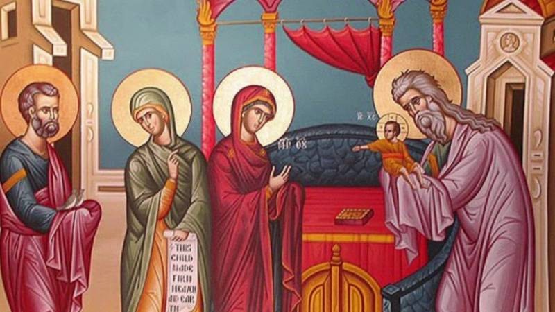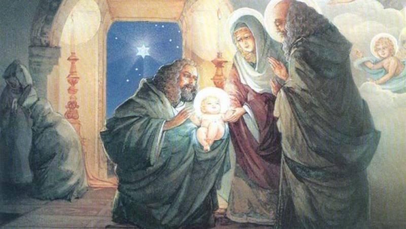 Там их встретил праведный старец Симеон. За 3 века до этого, выполняя перевод с еврейского языка на греческий священного писания, он увидел фразу о том, что непорочная девушка родит ребенка. Он не поверил в это, и решил написать, что это будет жена. В это время перед ним явился ангел, который сказал, что Симеон будет жить до тех пор, пока не убедится в искренности этих слов.