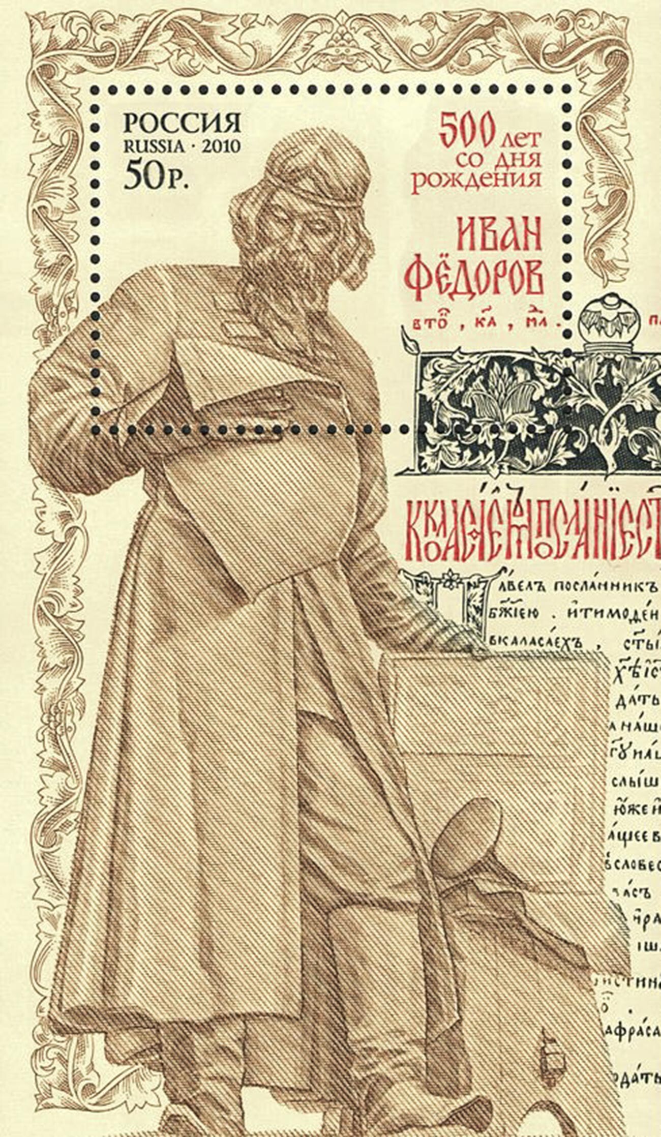 Почтовая марка по случаю 500 лет со дня рождения первопечатника Ивана Фёдорова