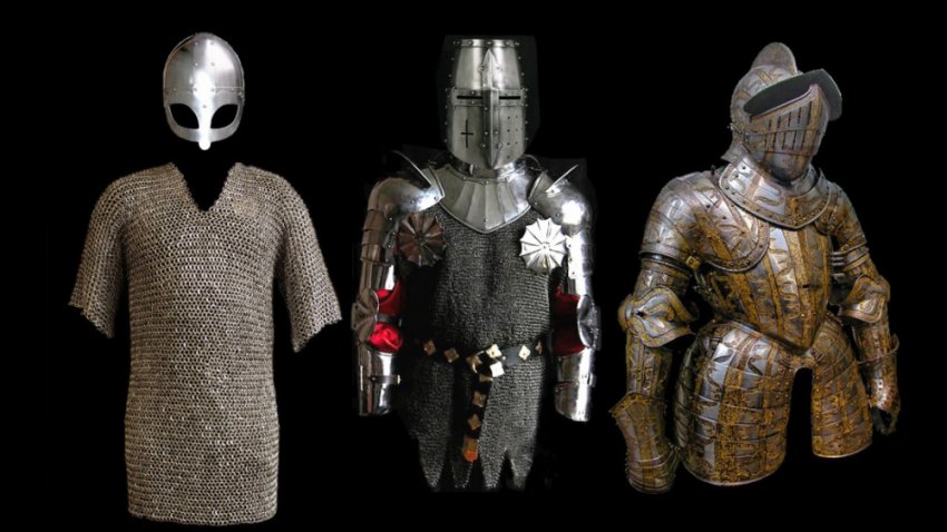 Кольчужные доспехи расширились от бирни с короткими рукавами до талии раннего средневековья до кольчуги в полный рост, которая закрывала владельца от колена до запястья.