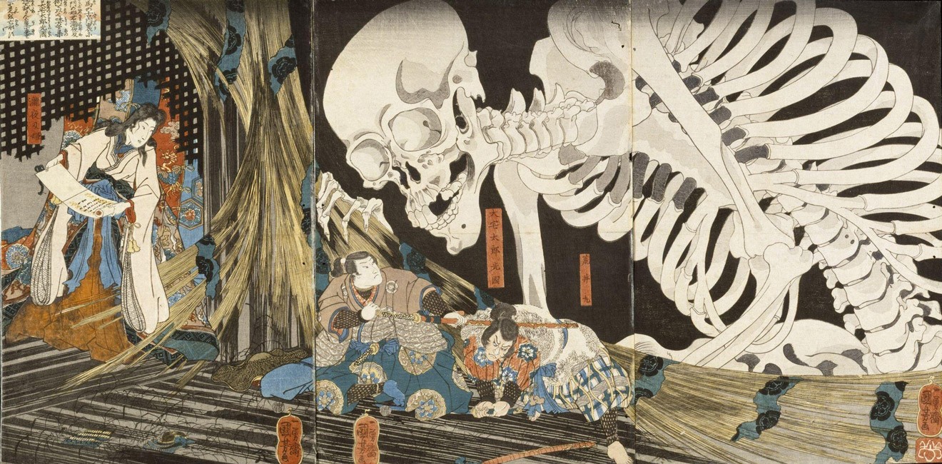 Мицукуни бросает вызов призраку-скелету, вызванному принцессой Такиясей. Триптих Утагавы Куниёси. Около 1844 годаVictoria and Albert Museum